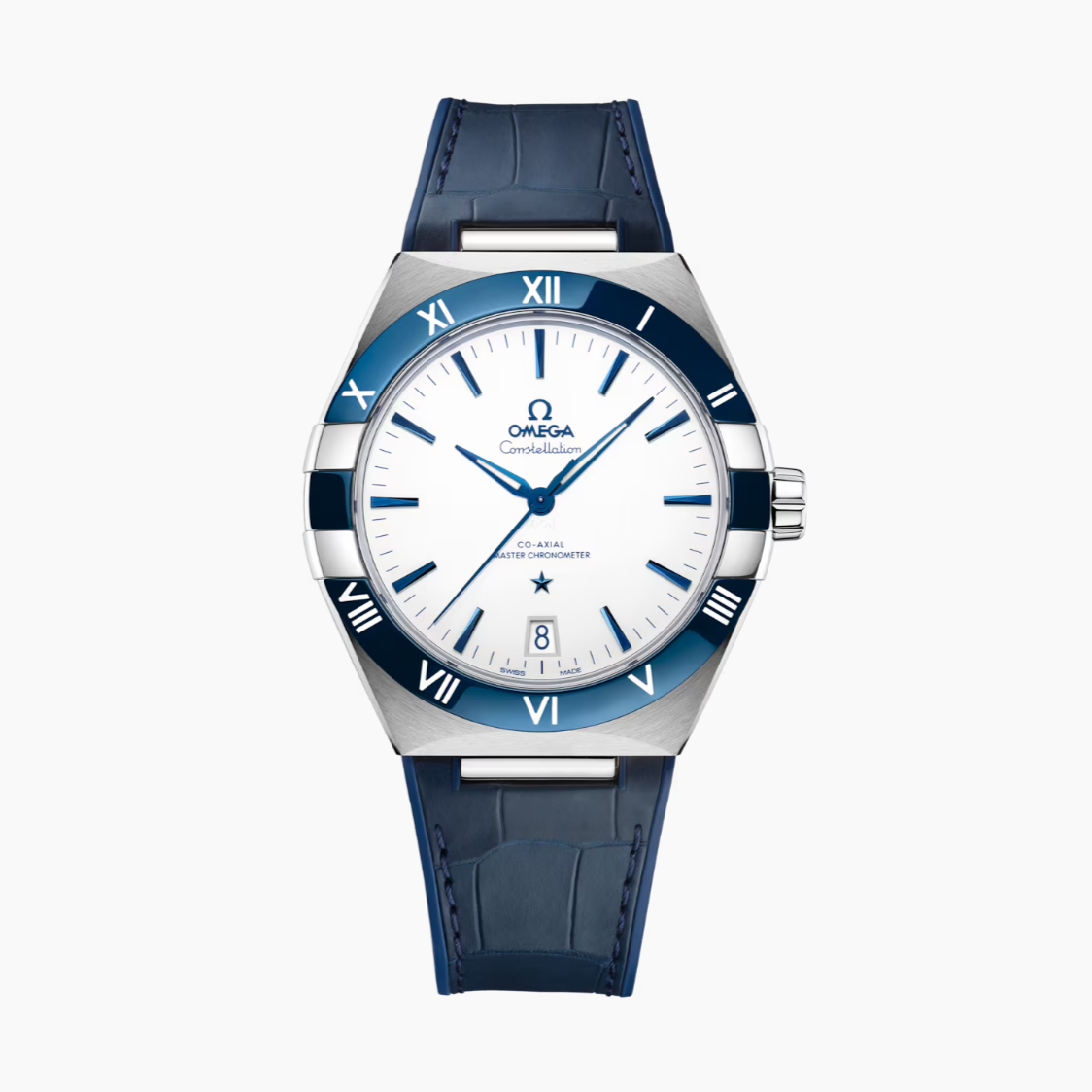 This 41mm stainless steel model features a polished blue ceramic bezel with Roman numerals in “Grand Feu” white enamel, a white ceramic dial and a date window at the 6 o'clock position. The hands, OMEGA logo, Constellation star and facetted indexes are all blued.
