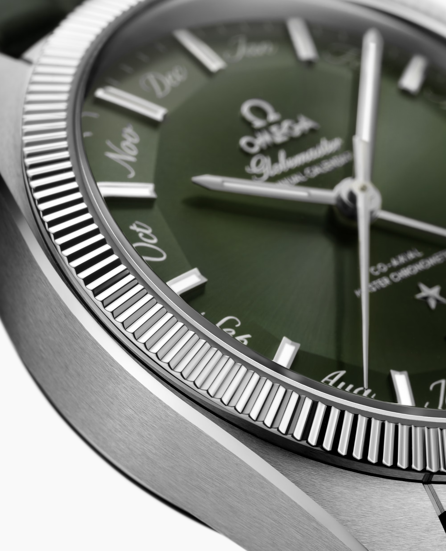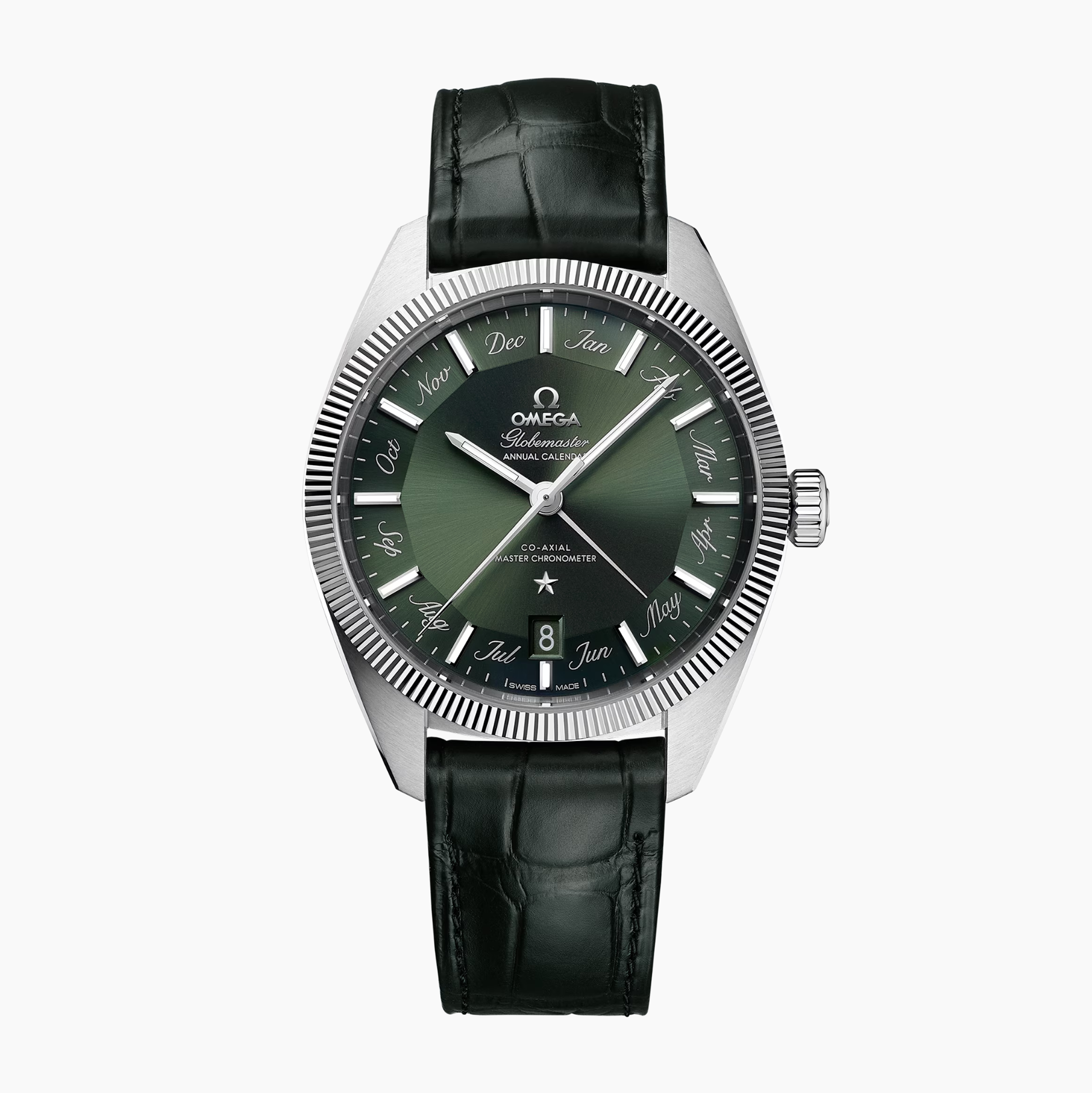 This watch has a green leather strap and is driven by OMEGA's Co-Axial Master Chronometer Annual Calendar Calibre 8922, featuring revolutionary anti-magnetic technology.