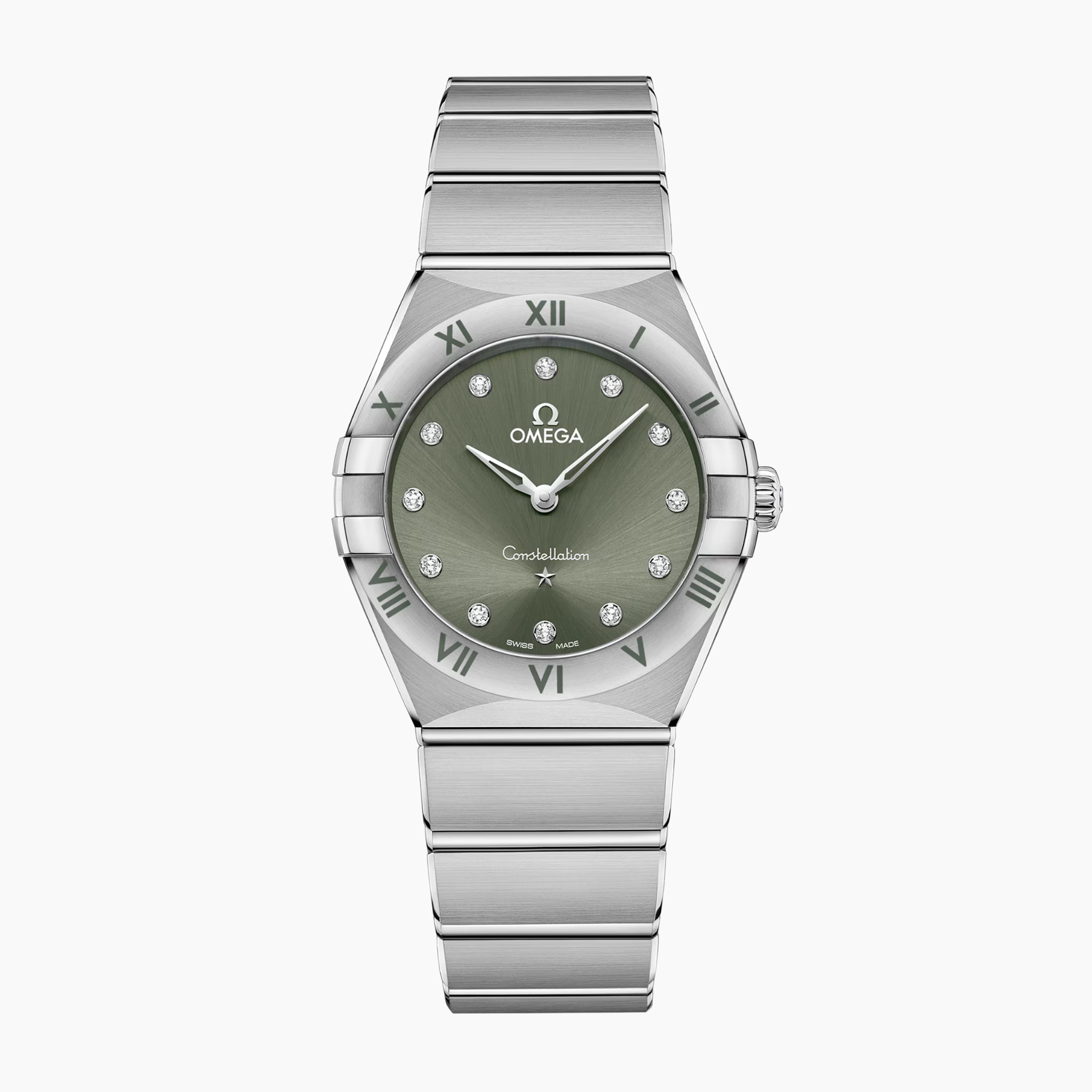 This 28mm model, with case and bracelet in stainless steel, features indexes and applied elements in 18K white gold, set against a striking green matcha dial. To give the bezel an extra pop of colour, OMEGA has highlighted the engraved Roman numerals in the same pastel shade.