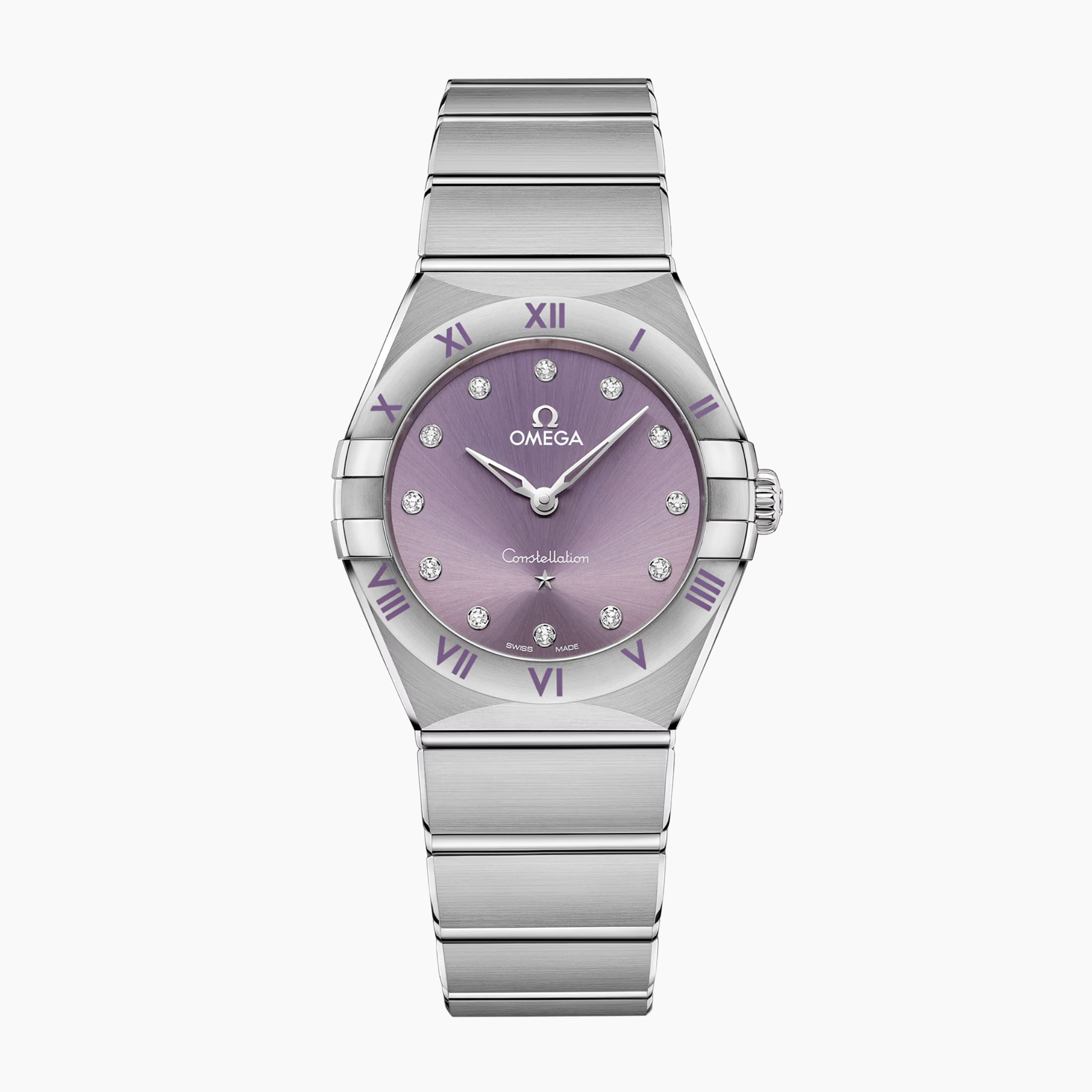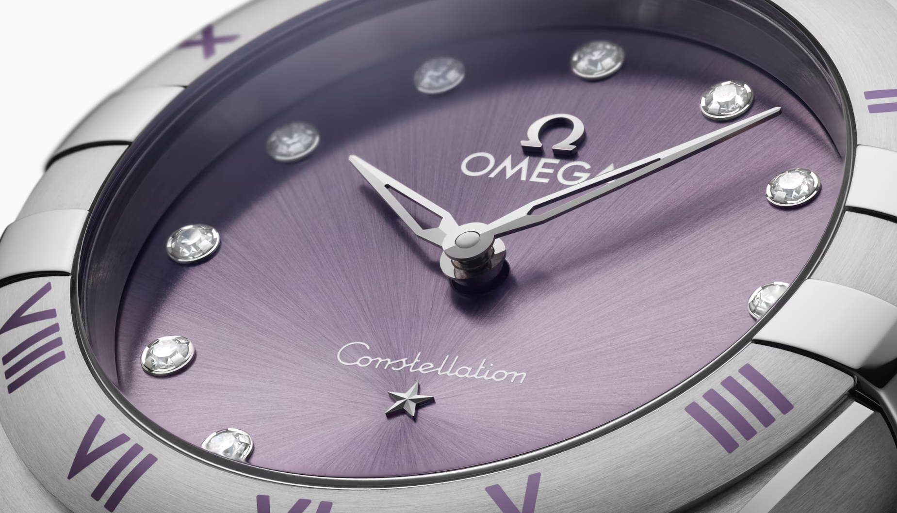 This 28 mm model, with case and bracelet in stainless steel, features indexes and applied elements in 18K white gold, set against a striking patchouli blossom dial. To give the bezel an extra pop of colour, OMEGA has highlighted the engraved Roman numerals in the same pastel shade.