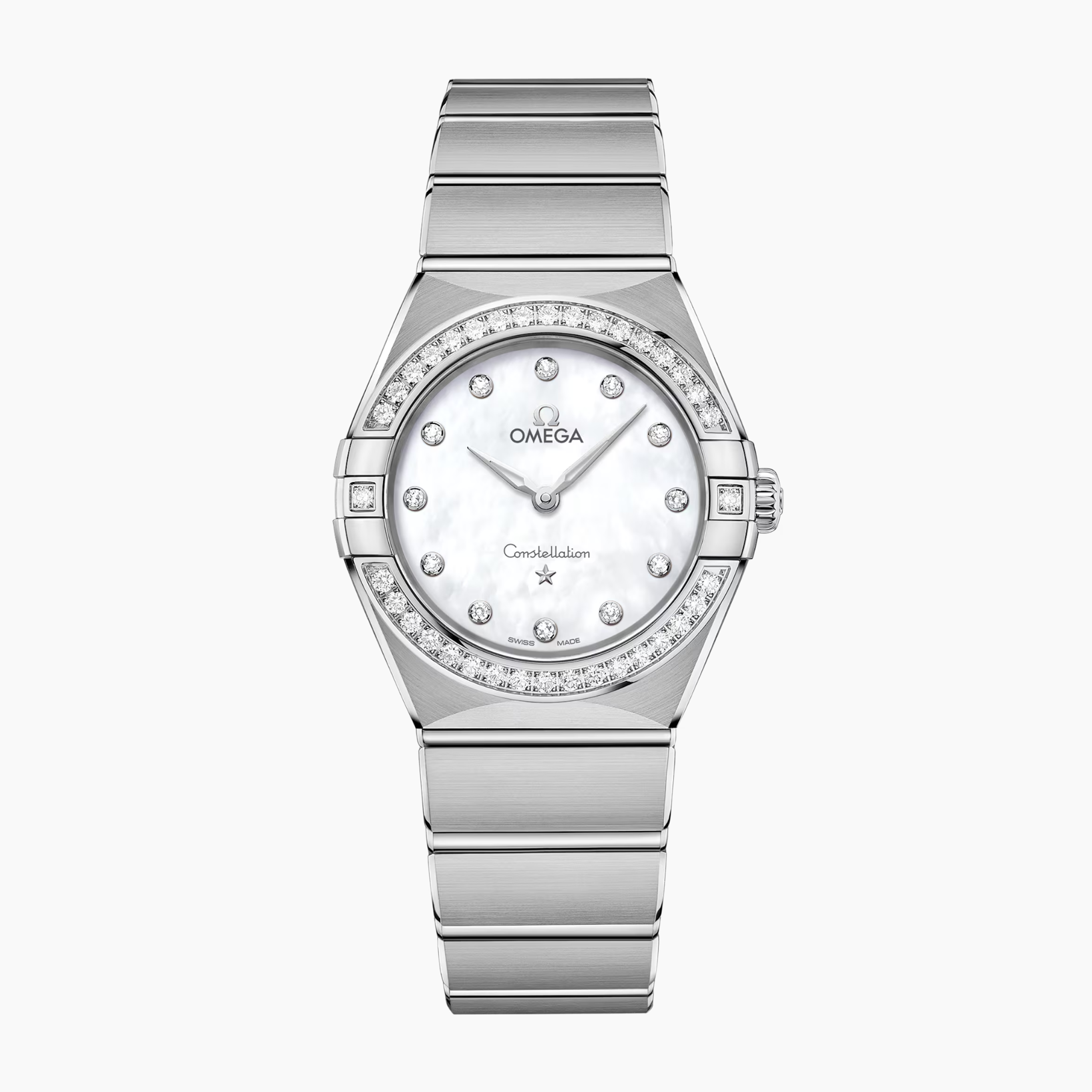 This 28mm stainless steel model features a diamond-paved bezel, white mother-of-pearl dial with diamond hour markers and scratch-resistant sapphire crystal. The hands, OMEGA logo, Constellation star and diamond holders are in 18K white gold.