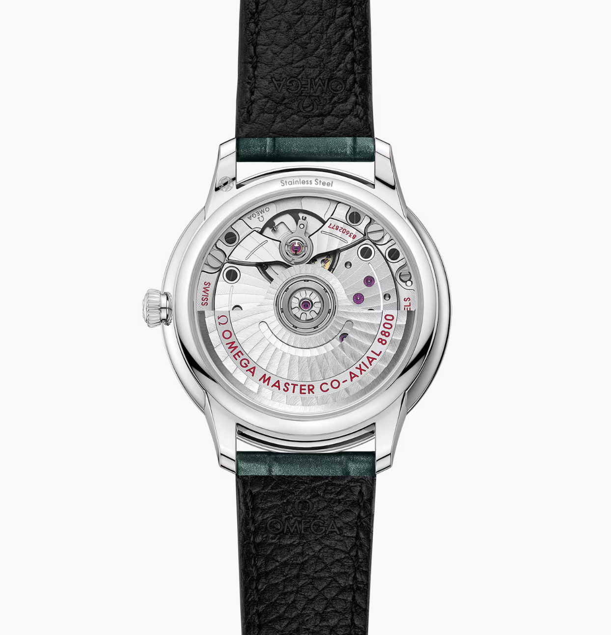 This Master Chronometer certified watch is presented on a shimmering pine green leather strap and is driven by the OMEGA Master Co-Axial Calibre 8800, which can be admired through the scratch-resistant sapphire crystal caseback.