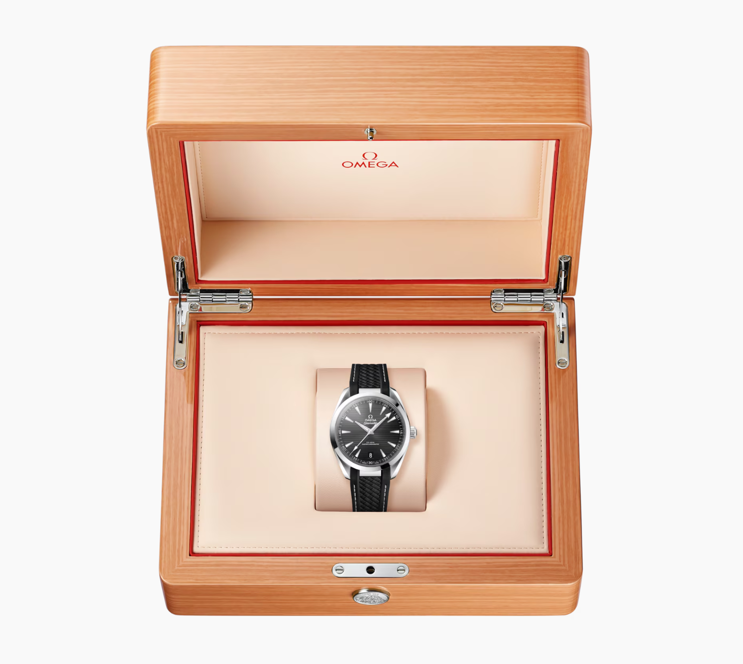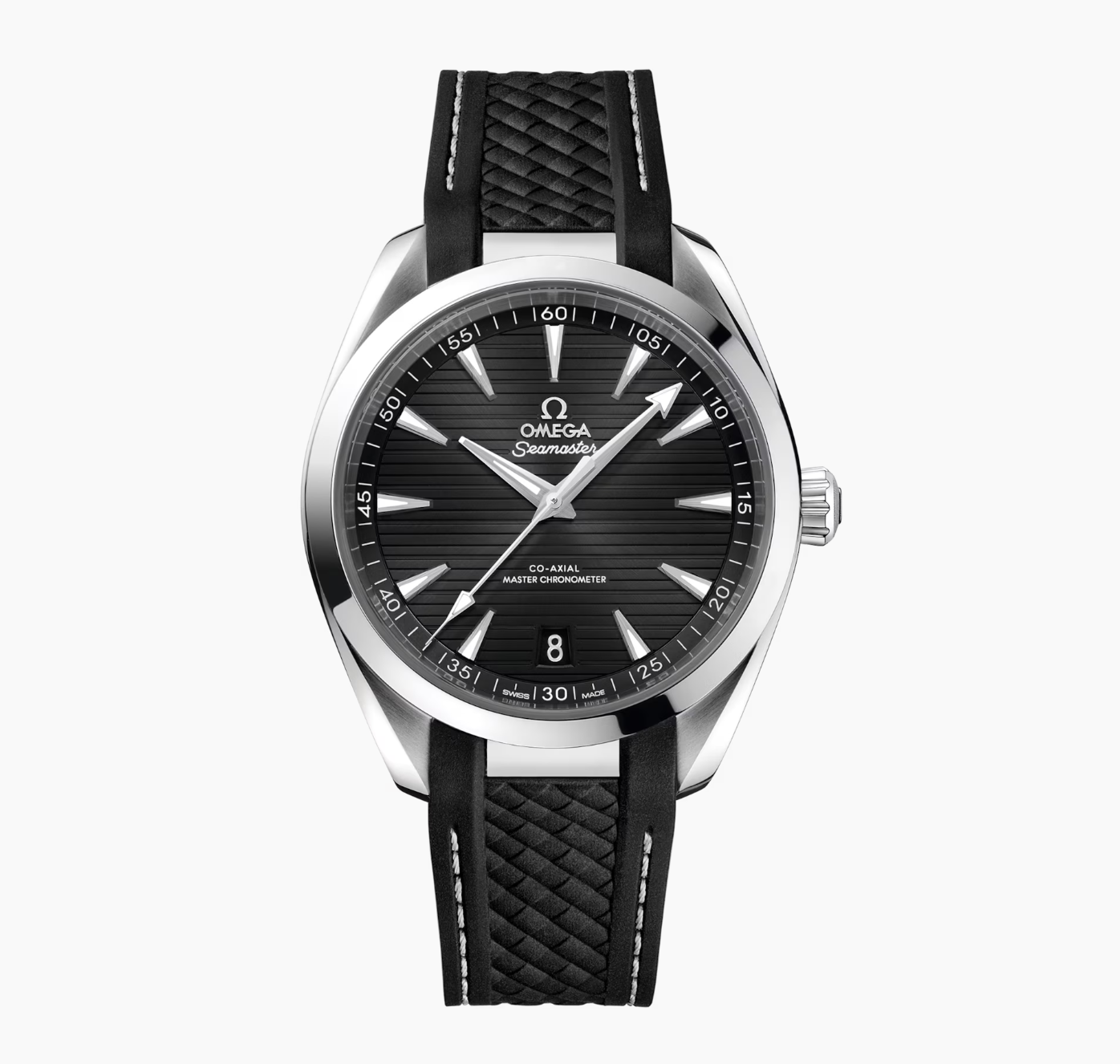 The black strap is made from structured rubber and includes grey lining and an additional stainless steel link which integrates it to the case. This certified chronometer is powered by the OMEGA Master Chronometer calibre 8900, certified at the industry’s highest standard by the Swiss Federal Institute of Metrology (METAS).