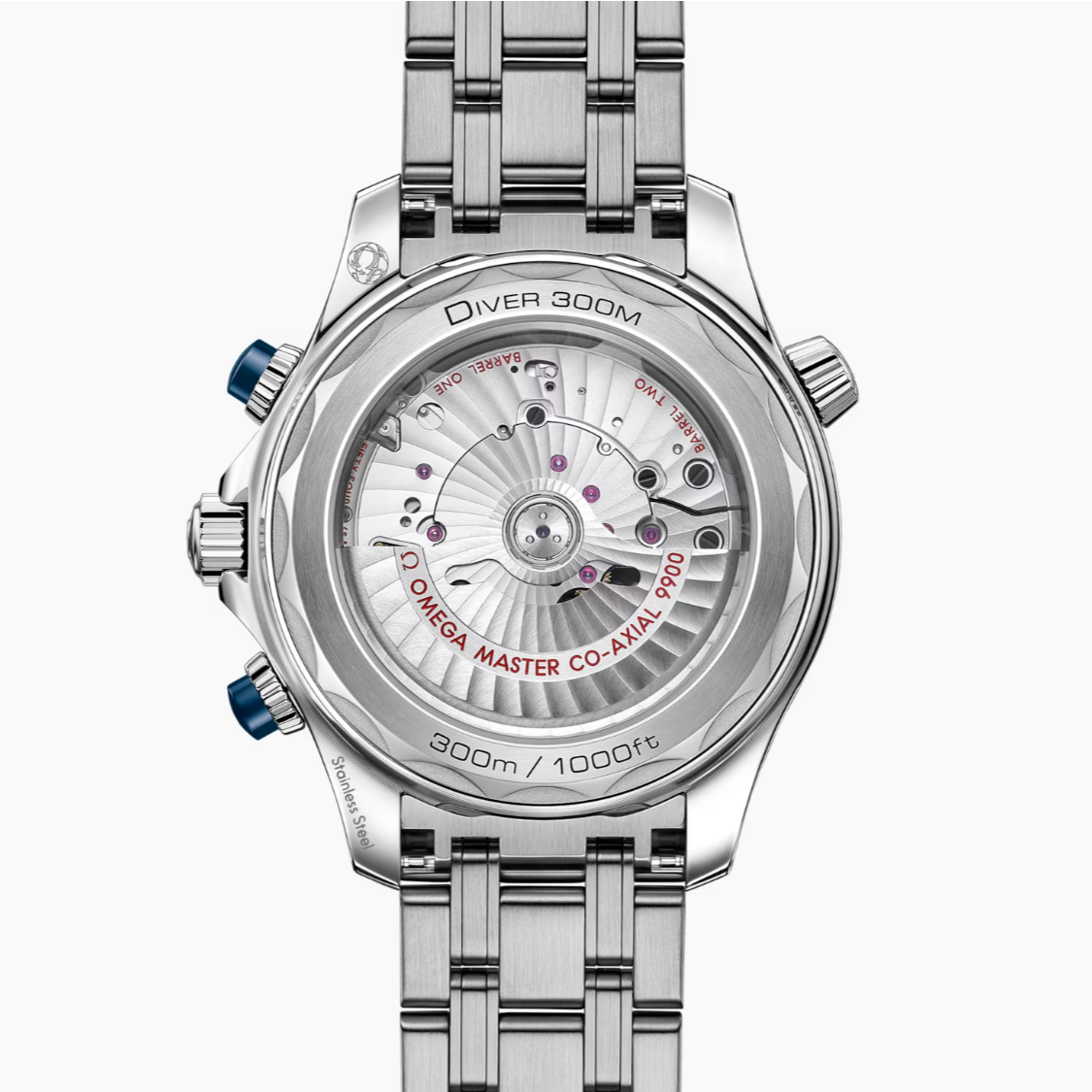 The watch is presented on a stainless steel bracelet and is driven by the OMEGA Master Chronometer Calibre 9900, which can be seen through the sapphire-crystal on the wave-edged caseback.