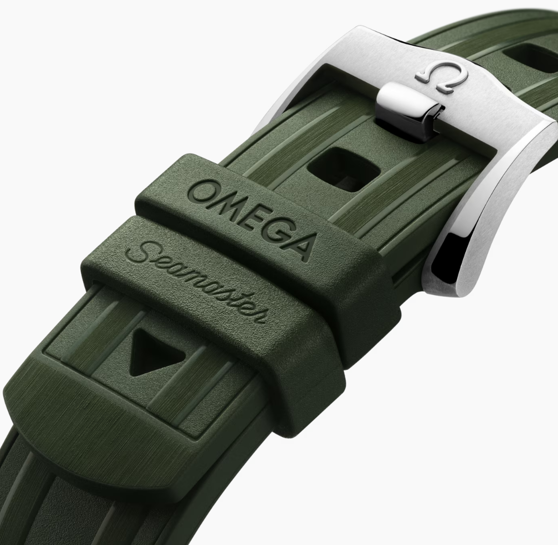 The watch is presented on a green rubber strap and is driven by the OMEGA Master Chronometer Calibre 8800, which can be seen through the sapphire-crystal on the wave-edged caseback.