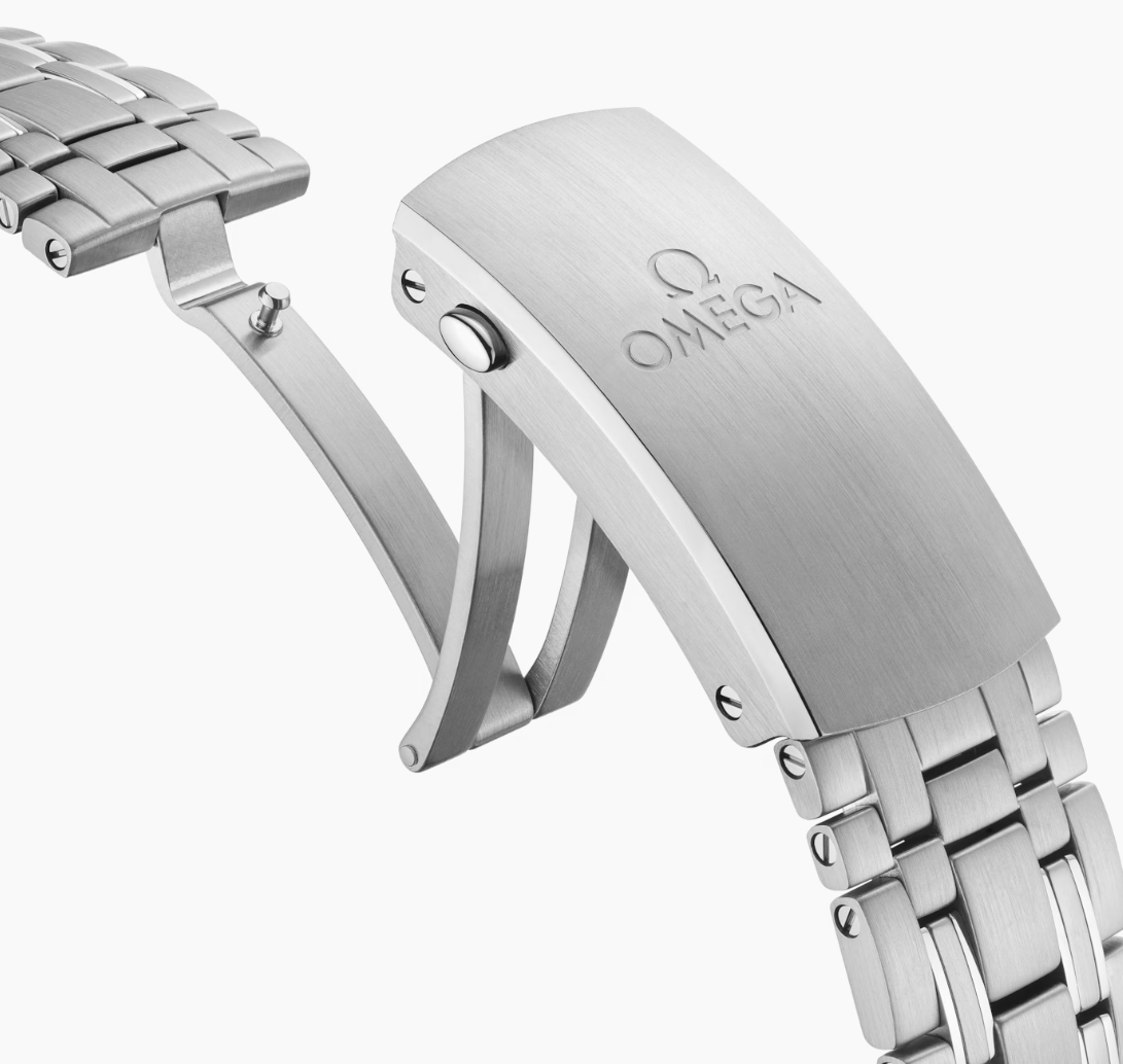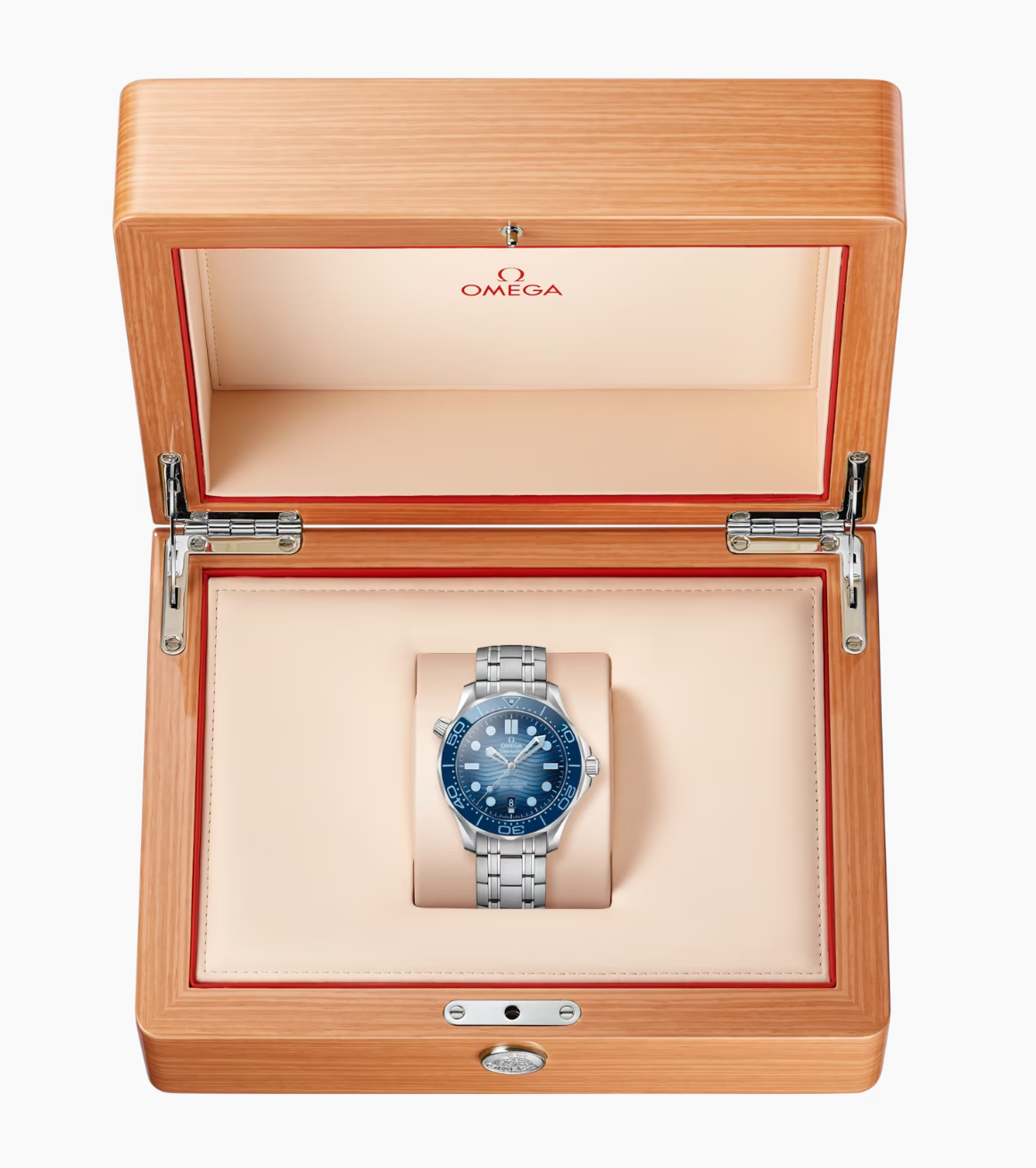 This 42mm Seamaster Diver 300M has a case and bracelet in stainless steel. The ceramic dial, in OMEGA’s own Summer Blue, is PVD-treated and has a gradient finish to reflect the watch’s level of water resistance. It also includes the 300M’s famous wave pattern.