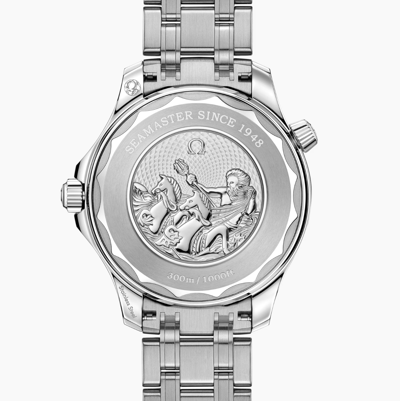 Turning the watch over reveals a stamped commemorative Seamaster logo depicting a trident-bearing Poseidon and two seahorses: OMEGA’s 1956 original and the brand’s current design. Behind which sits OMEGA’s Co-Axial Master Chronometer calibre 8800, certified at the industry’s highest level by the Swiss Federal Institute of Metrology (METAS).