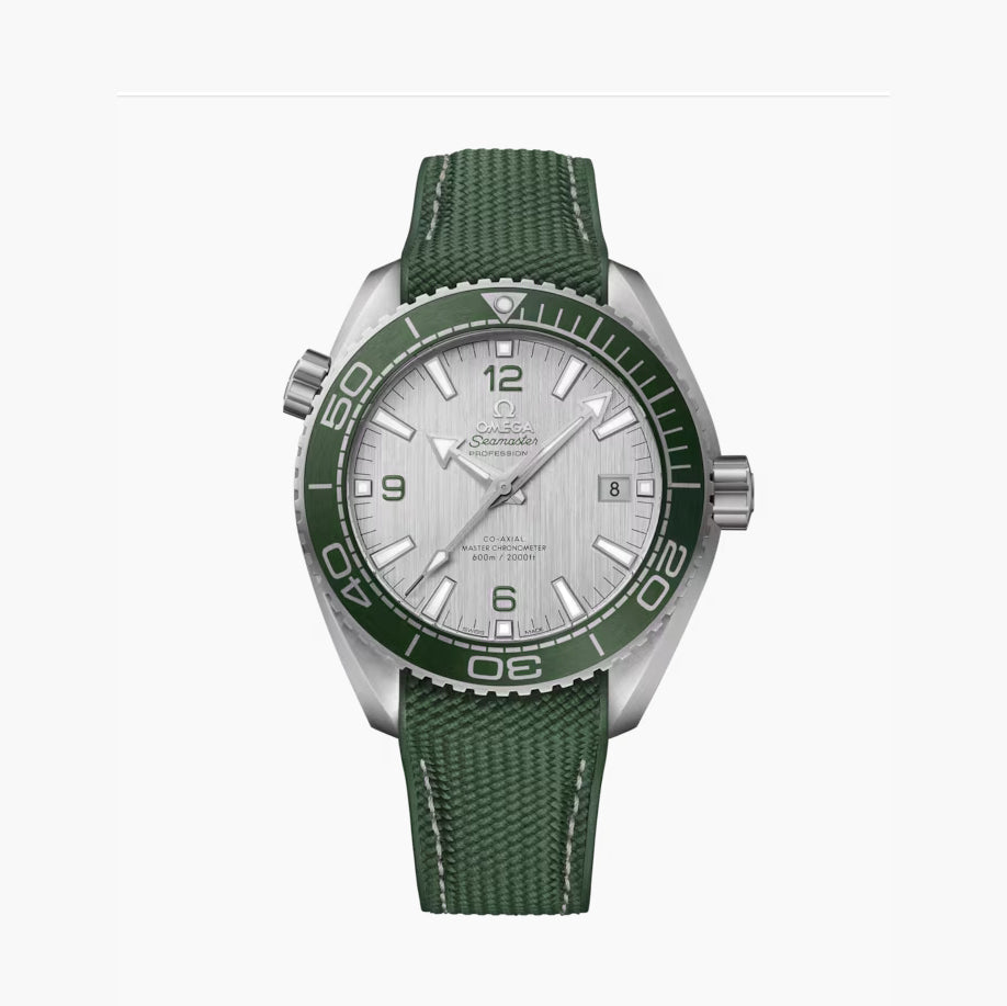 Powered by the Co-Axial Master Chronometer Calibre 8900, this Seamaster Planet Ocean is worn on an integrated green rubber strap with a structured pattern and light grey and green stitching. The NAIAD LOCK caseback is completed with a metallized seahorse on the sapphire crystal.