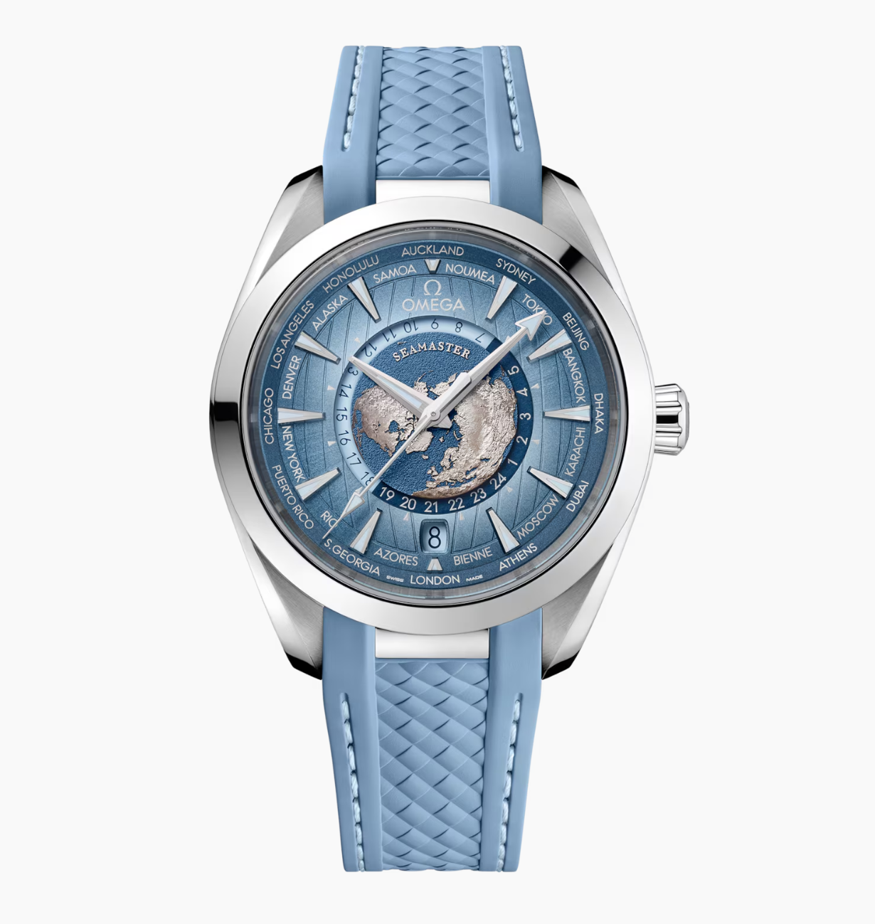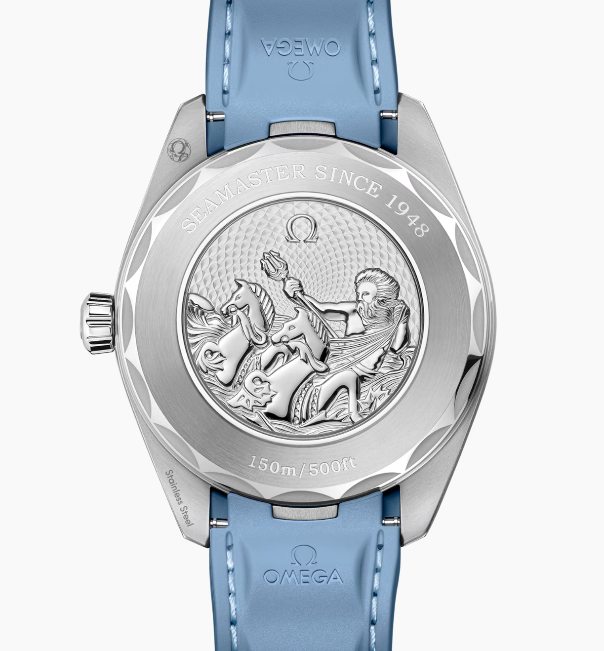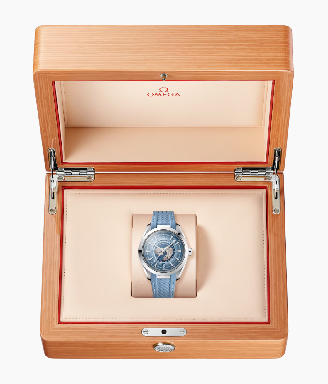 The dial is sun-brushed in OMEGA’s own Summer Blue with a gradient finish to reflect the watch’s level of water resistance and includes vertical teak stripes and rhodium-plated hands and indexes filled with a unique light blue Super-LumiNova.