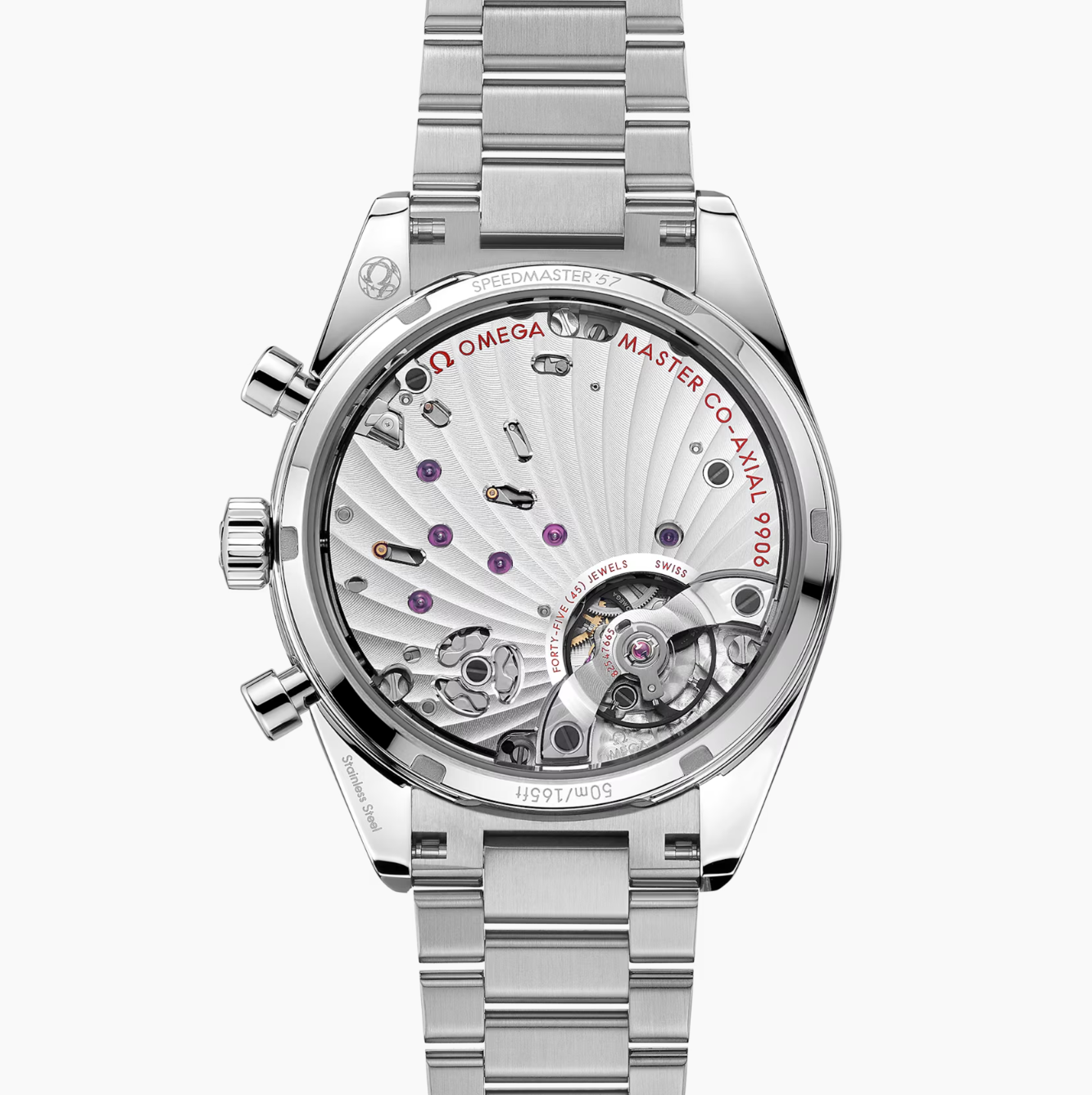 The brushed bezel includes a blackened tachymeter scale, while on the caseback, there is a “Speedmaster ‘57” engraving as well as a flat sapphire crystal with an anti-reflective treatment inside.
