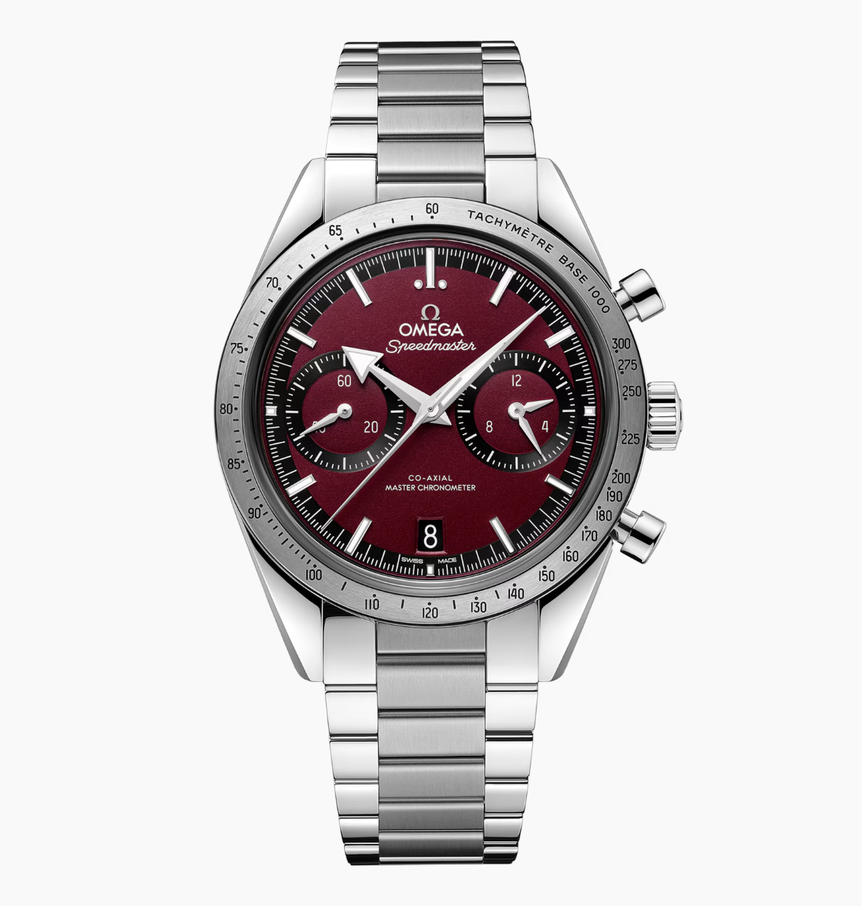This 40.50mm model, inspired by the legendary 1957 original, features a stainless steel case and a burgundy dial with rhodium-plated hour markers and “Broad Arrow” hands - all featuring white Super-LumiNova. There is a date window at 6 o’clock, a small seconds subdial at 9 o’clock, and 12-hour and 60-minute chronograph recorders on the subdial at 3 o’clock.