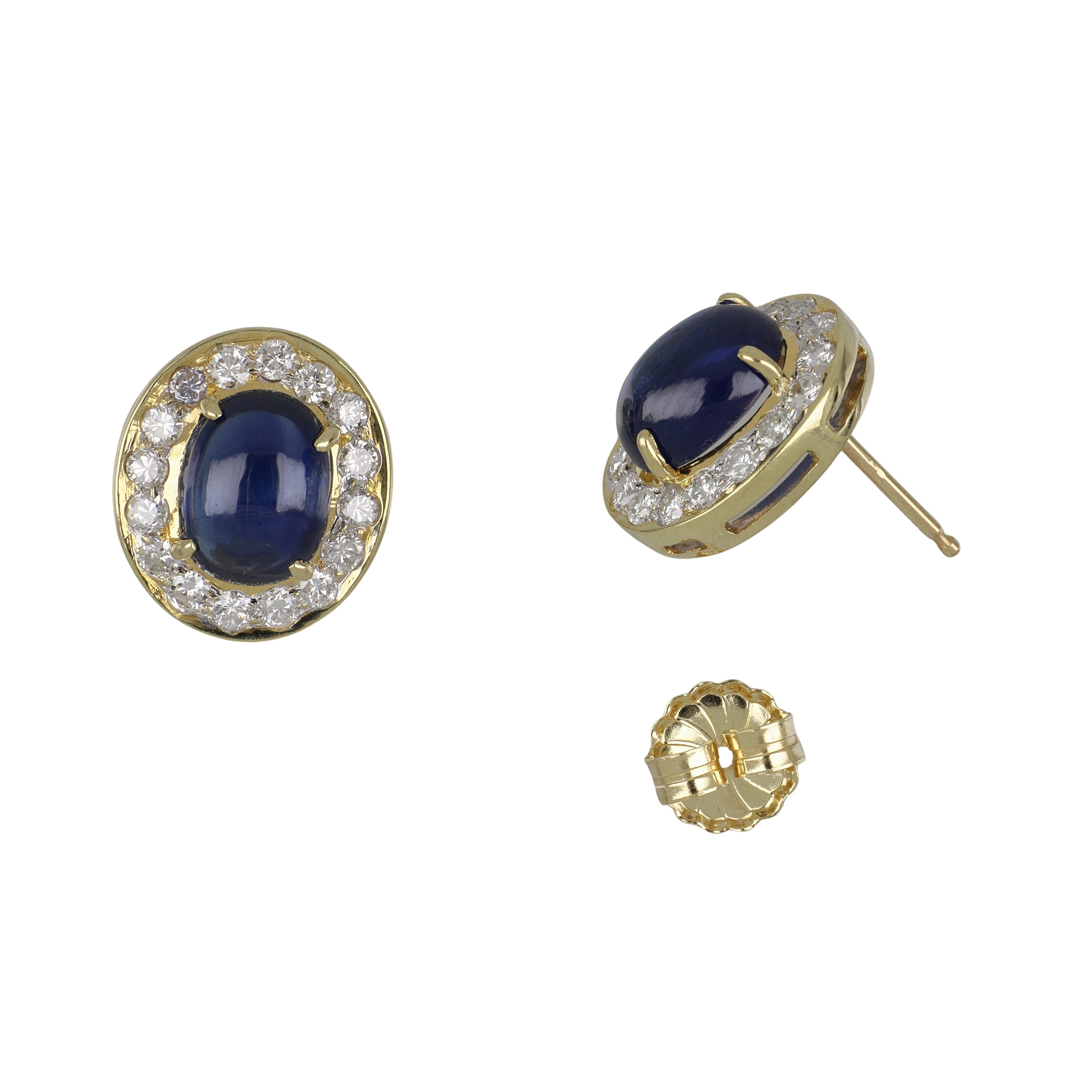 A pair of cabochon-cut sapphire and round diamond halo earrings set in 18K yellow and white gold.