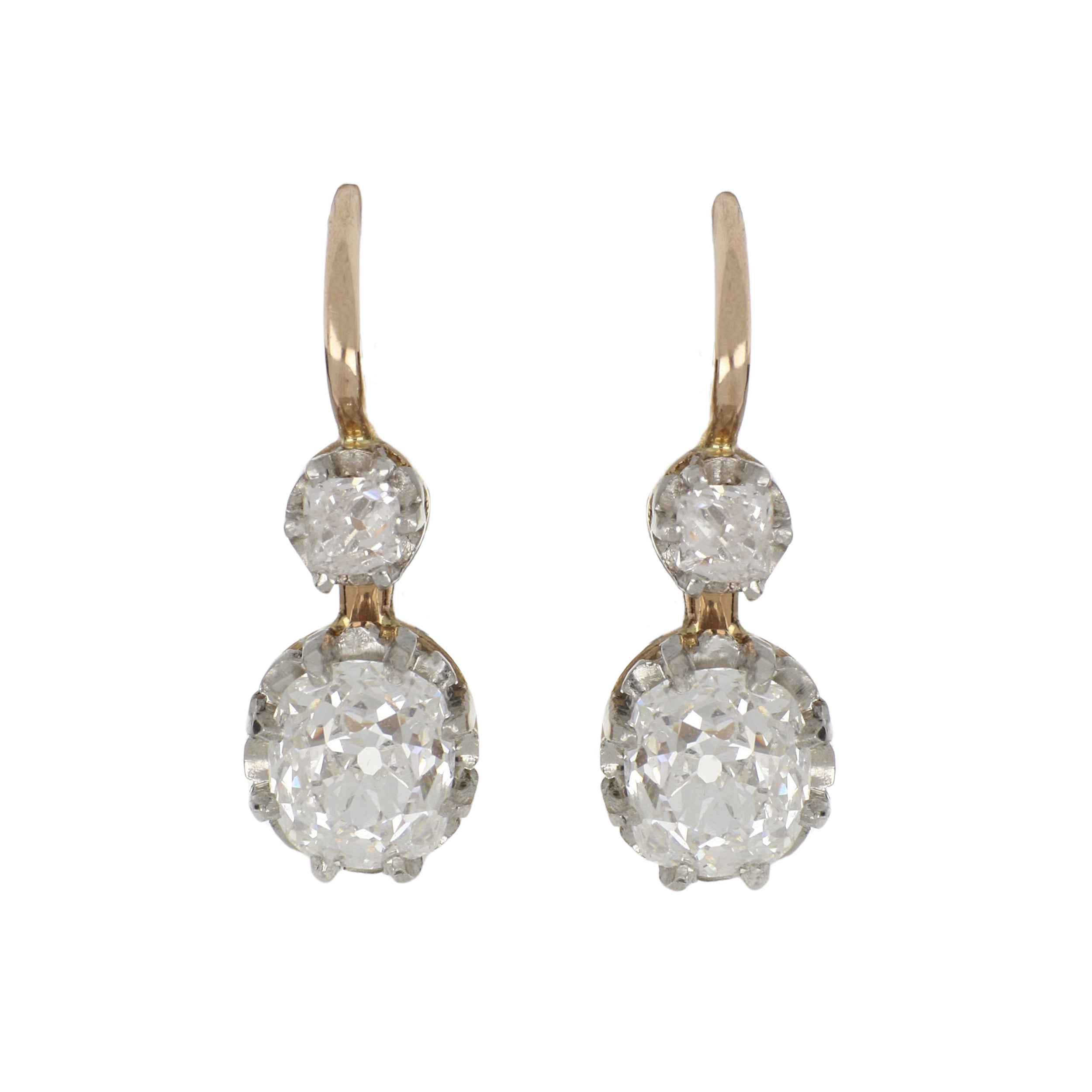 A pair of antique dormeuse earrings set with Old Mine-cut diamonds in 18K yellow gold and platinum.