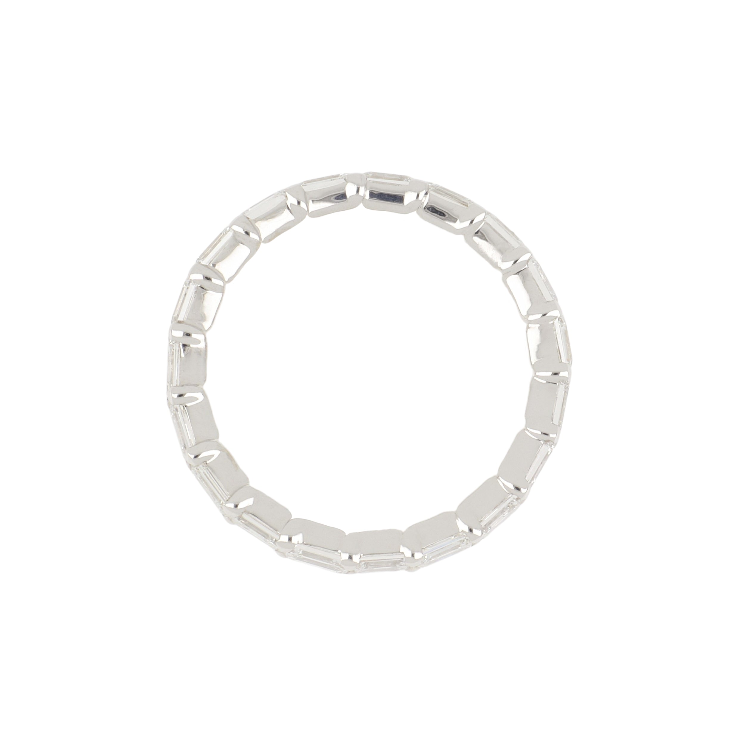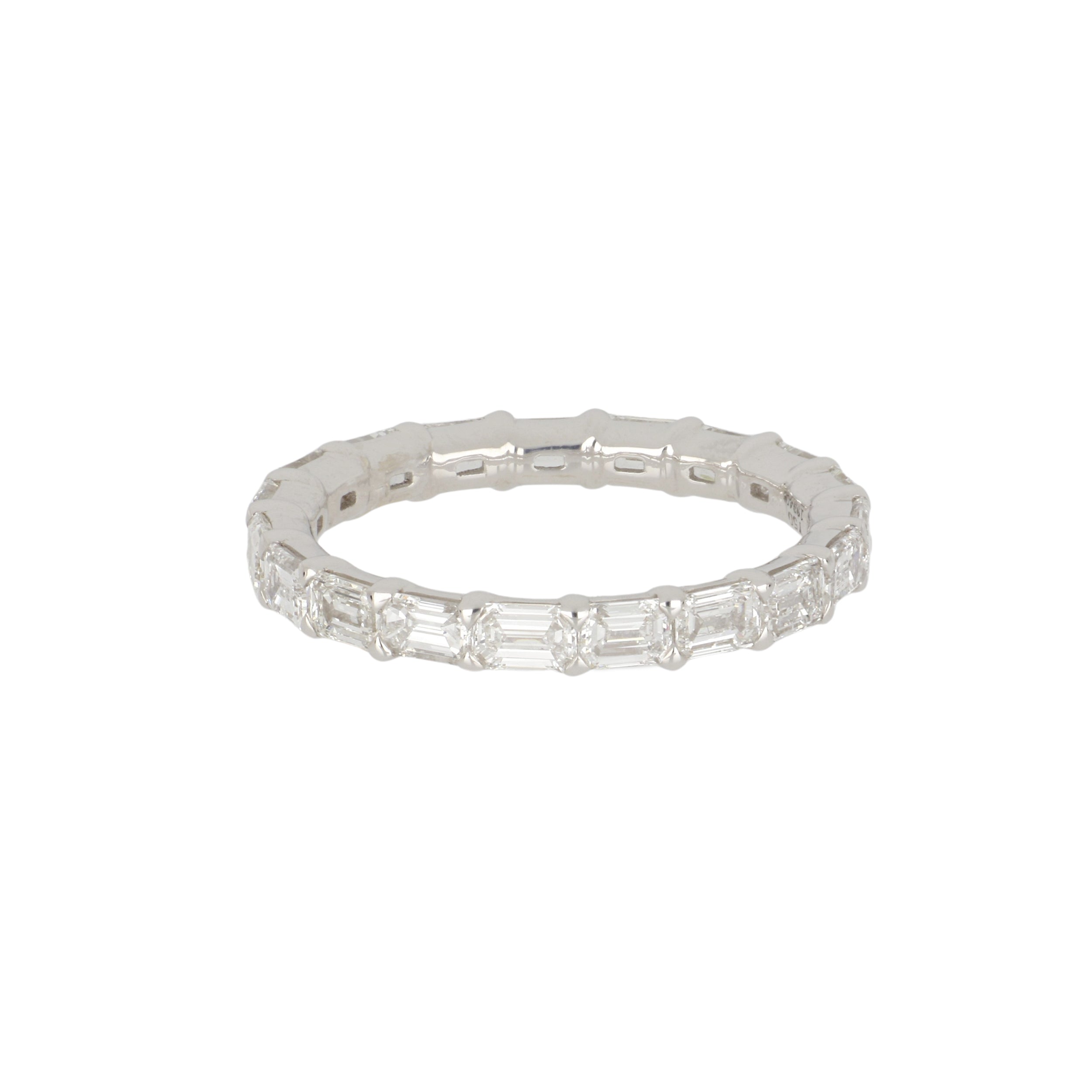 An emerald-cut diamond eternity buttercup band set horizontally, in 18K white gold.