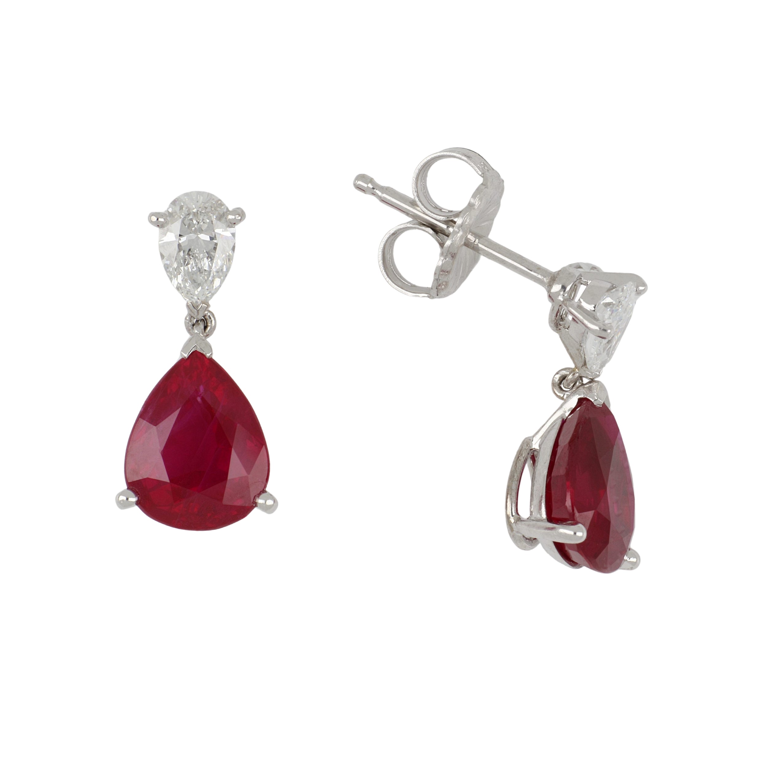 A pair of pear shape ruby and diamond drop earrings set in 18K white gold.