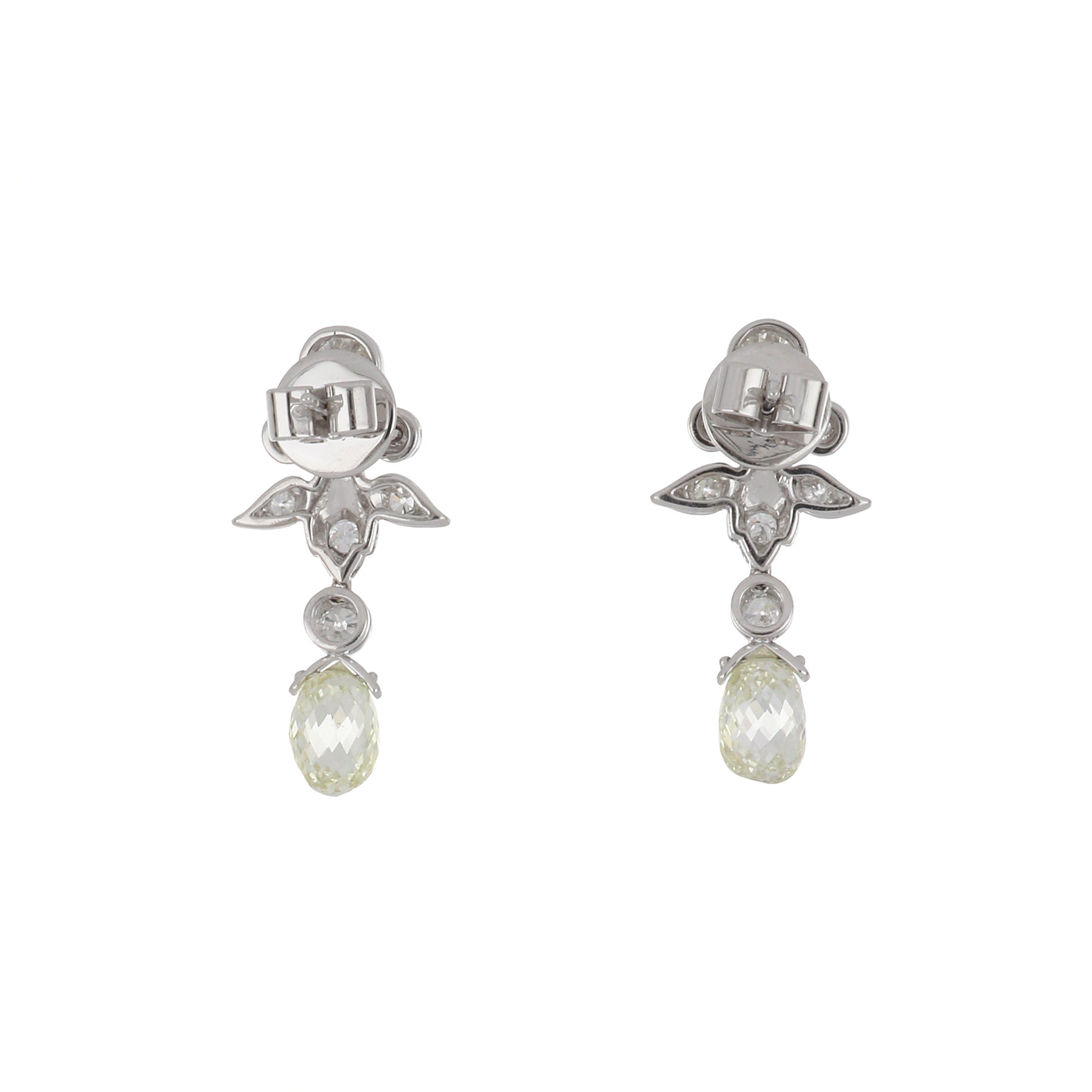 A pair of garland-style earrings crafted from antique Old European-cut diamond tops with briolette-cut diamond drops, set in 18K white gold.