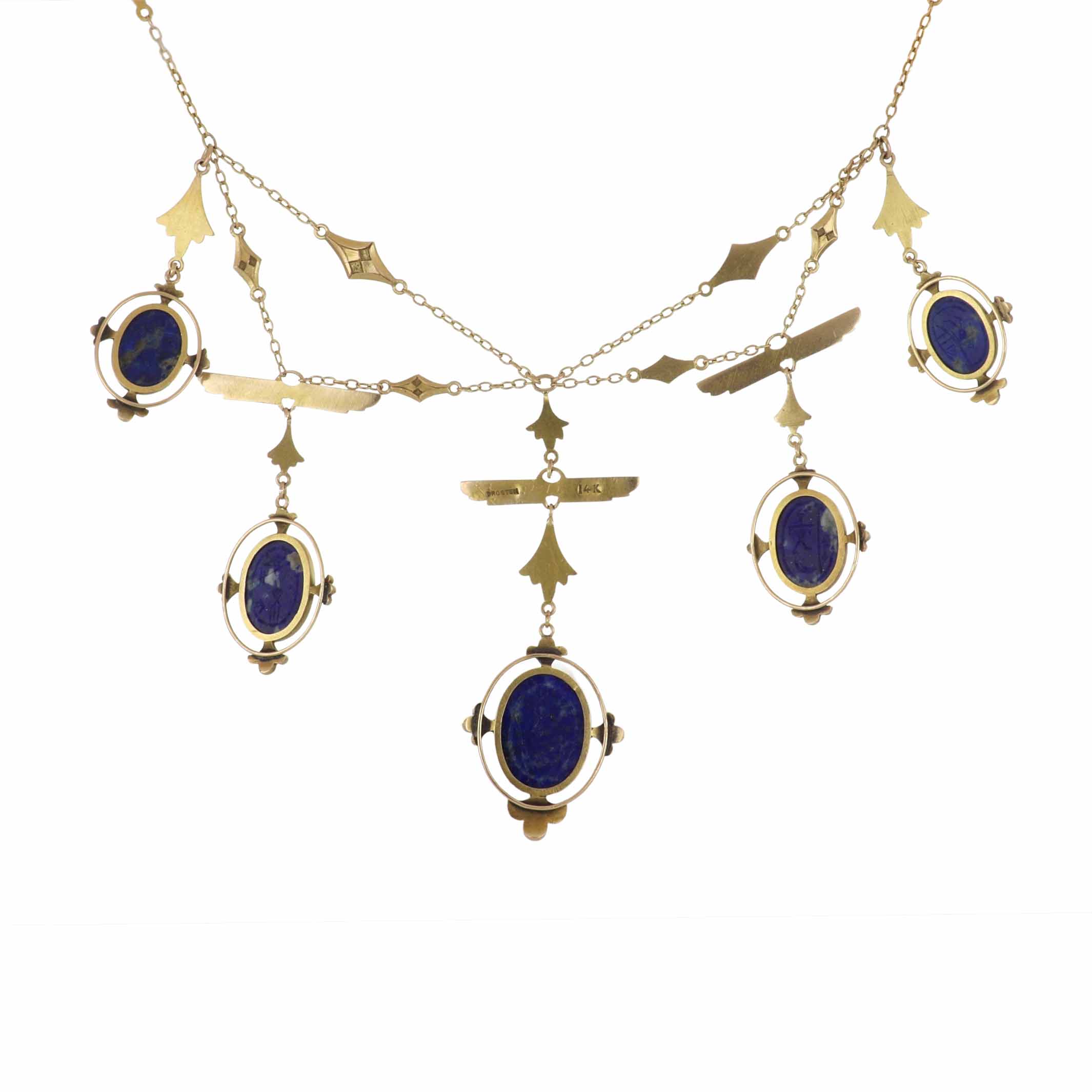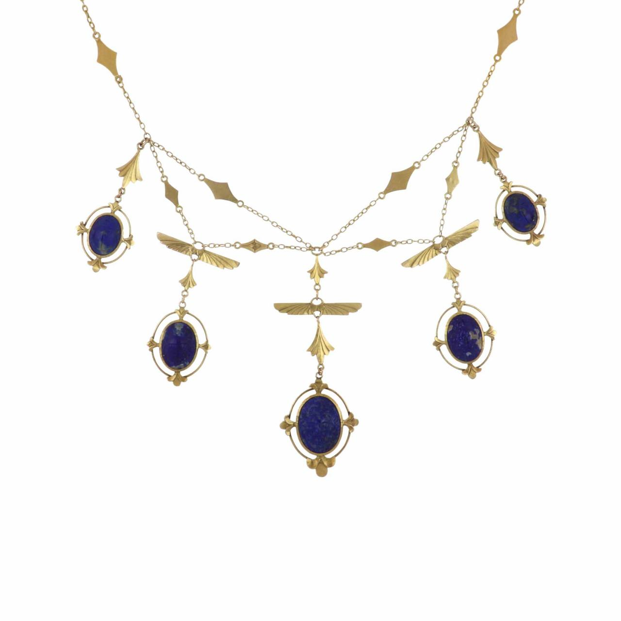 An Art Deco Egyptian Revival swag necklace, with carved lapis lazuli scarab and Wings of Isis, in 14K yellow gold. Circa 1920.Antique CollectionLength: 14.5" with 2.5" drop; alterableSigned: Brostein