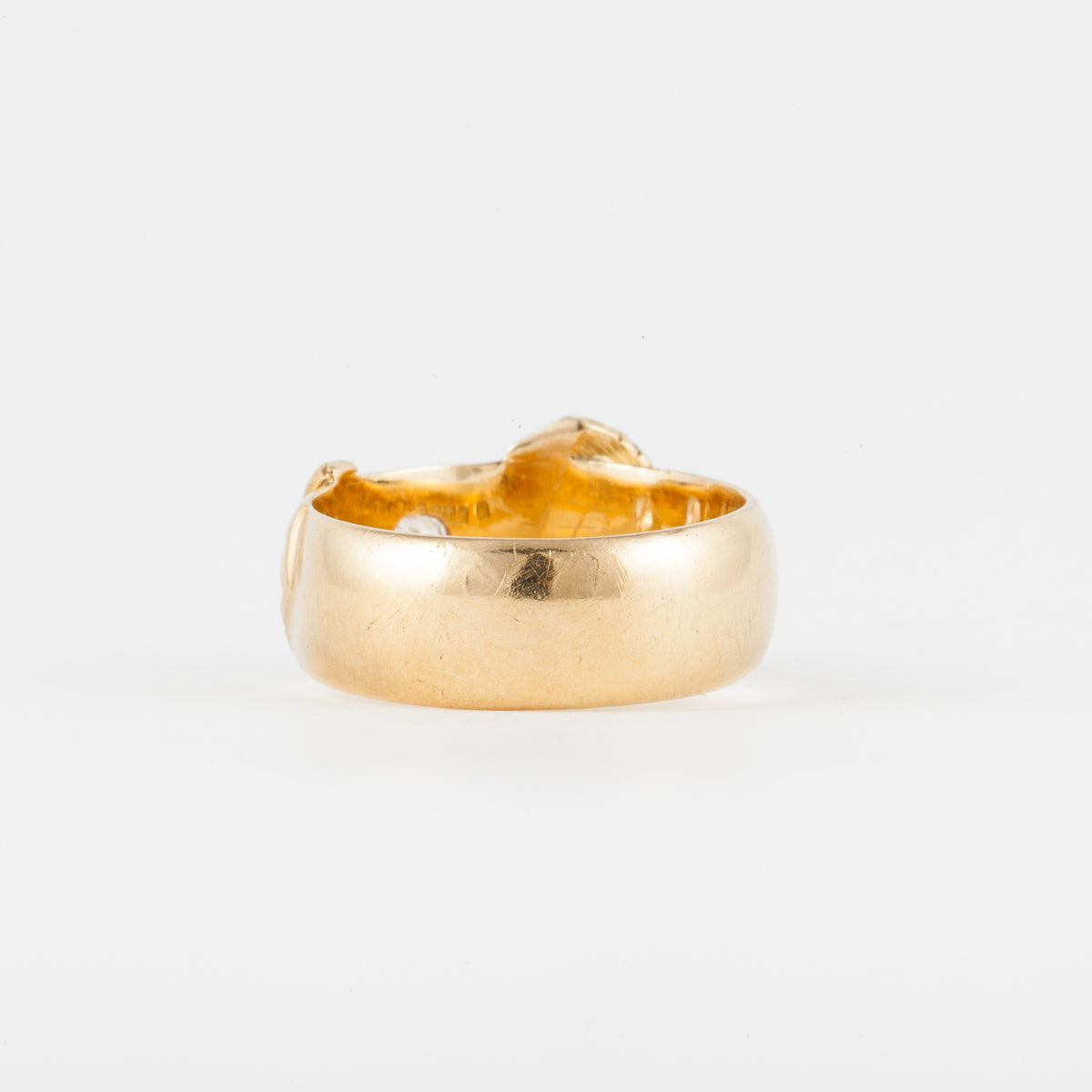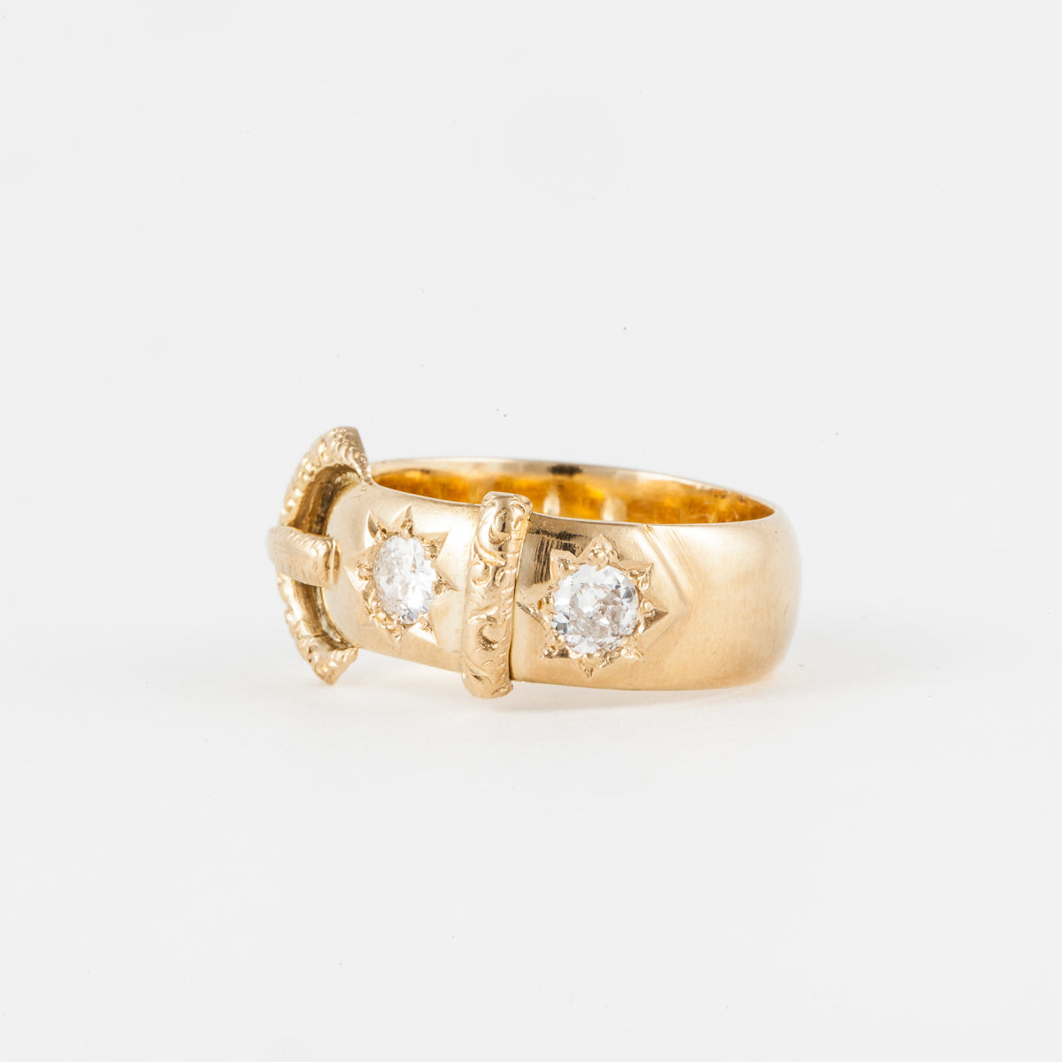 An Edwardian buckle ring in 18k yellow gold, set with two old mine-cut diamonds. The diamond buckle motif symbolizes eternal loving strength. London, circa 1917.