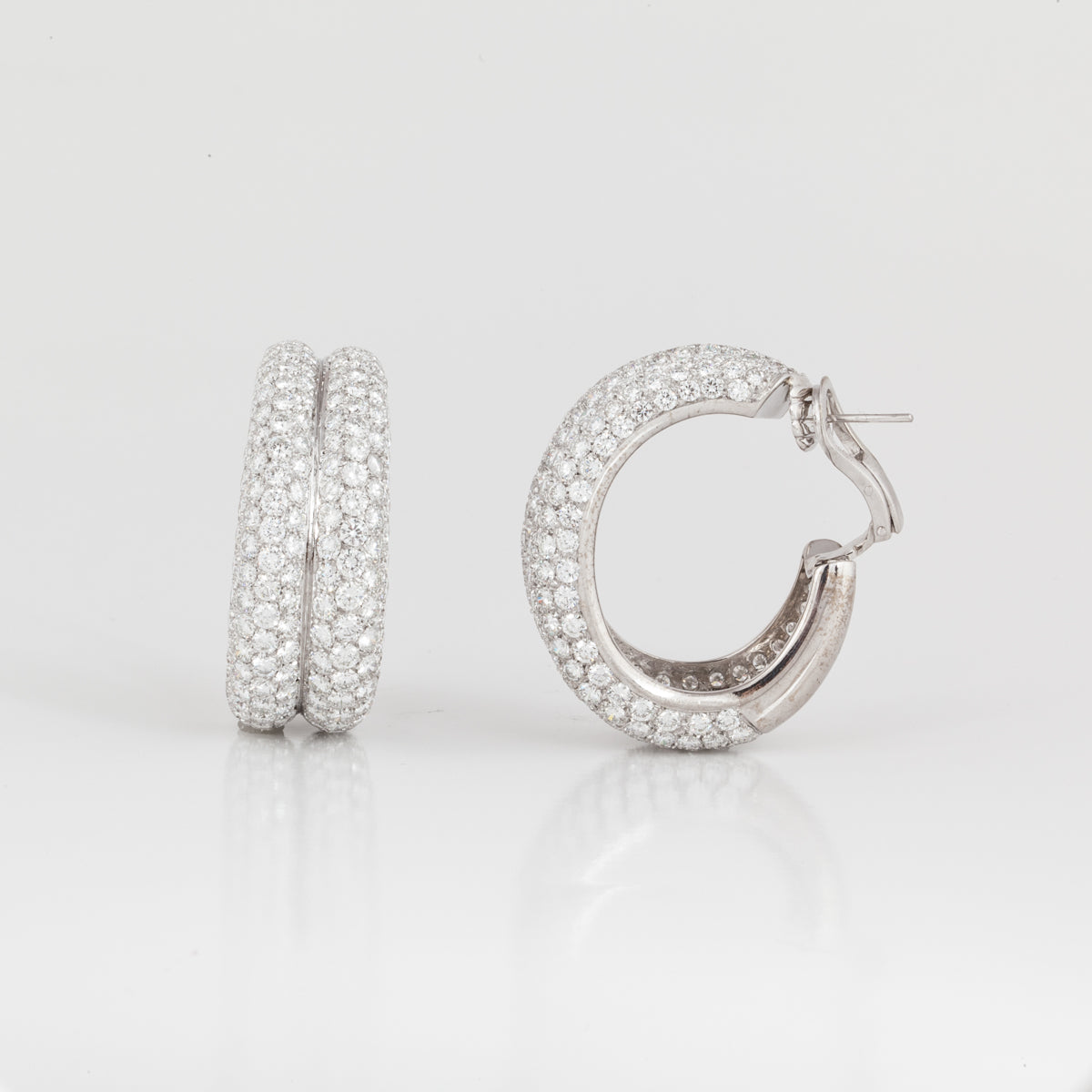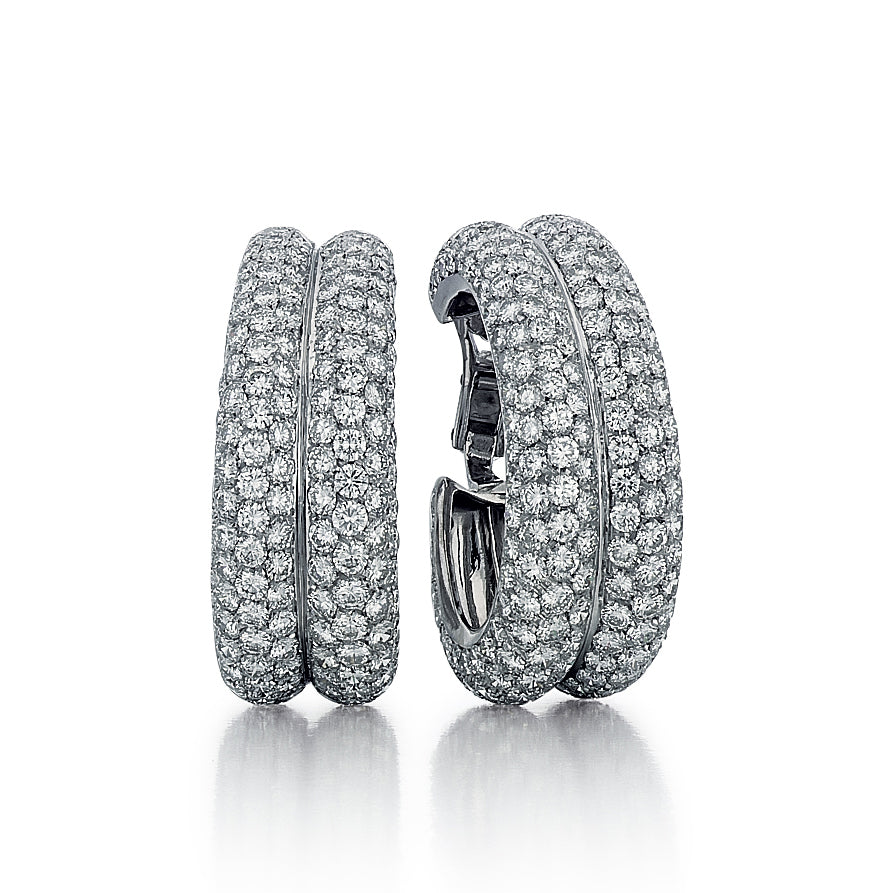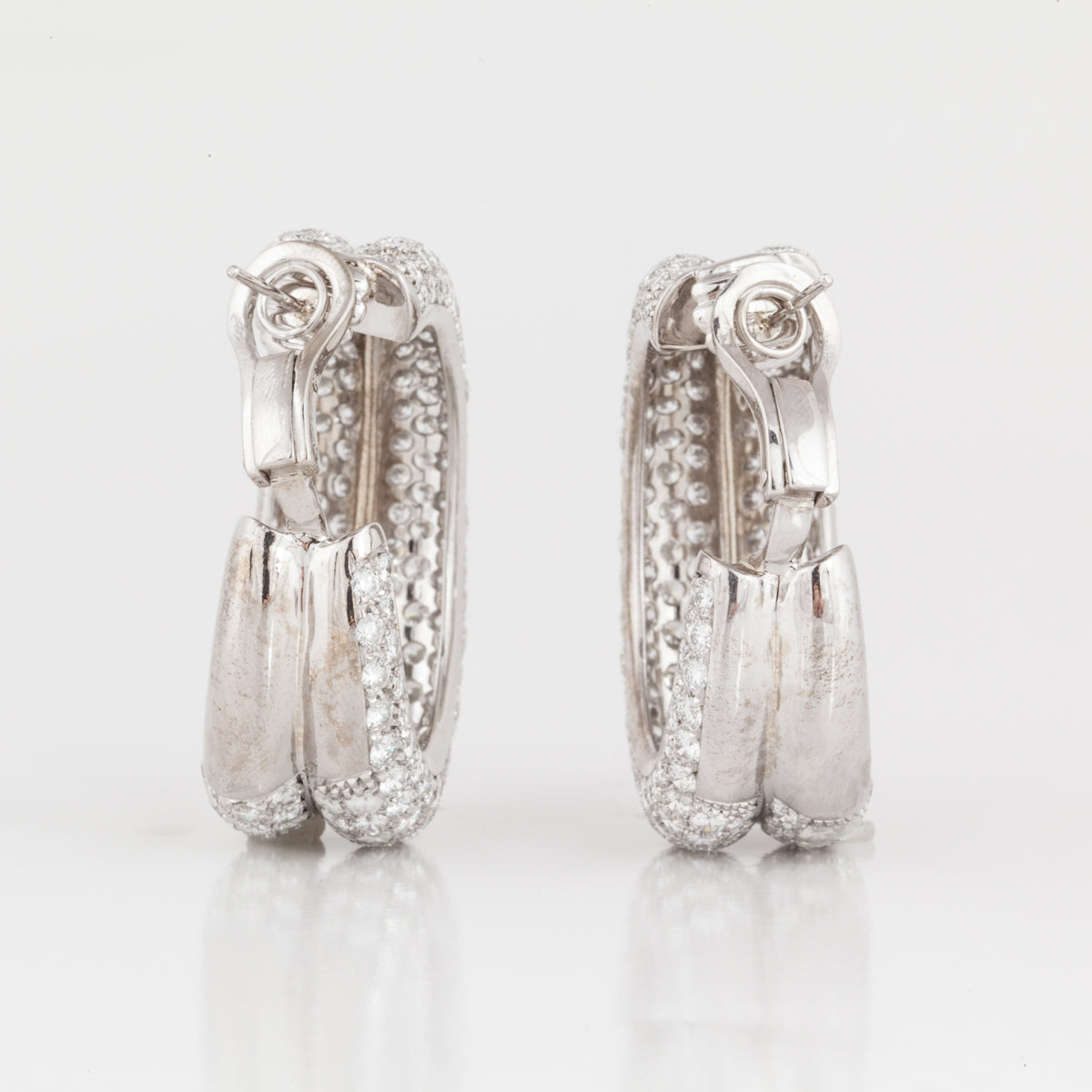 A pair of estate pave round brilliant-cut diamond double loop, hoop earrings of substantial size, set in 18K white gold. Circa 2010.