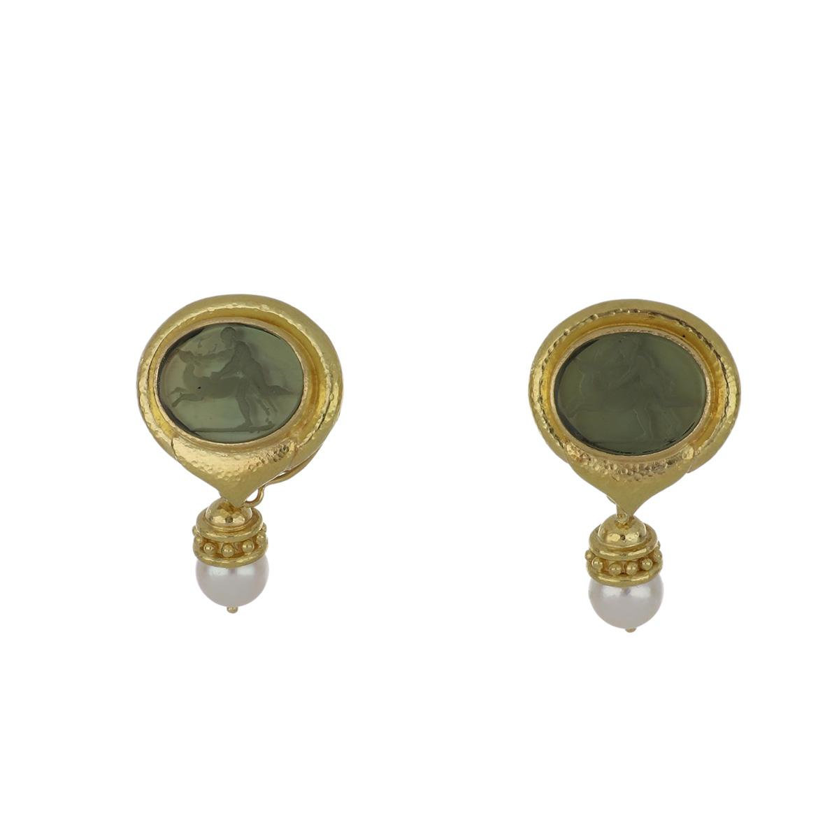 An estate pair of Elizabeth Locke sea foam green Venetian glass intaglio day/night earrings with pearl drops in 19K yellow gold. Circa 2000.Vintage & Estate CollectionLength: 1.5 inches