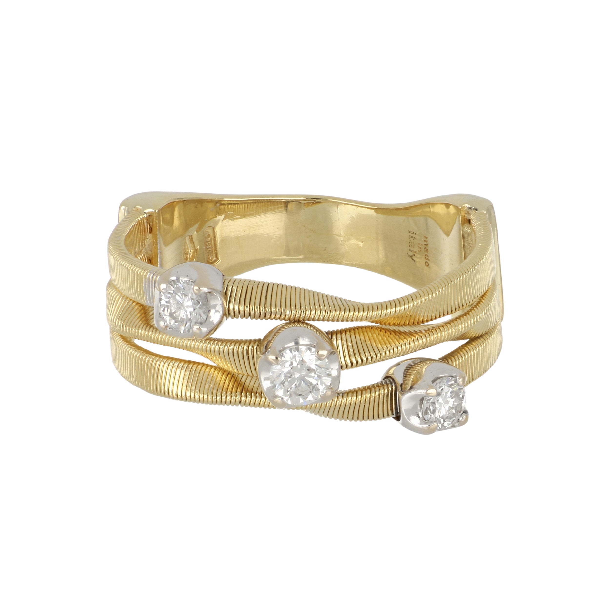 An estate Marco Bicego "Marrakech" three stone round brilliant-cut diamond band, set in 18K yellow gold. Circa 2020.