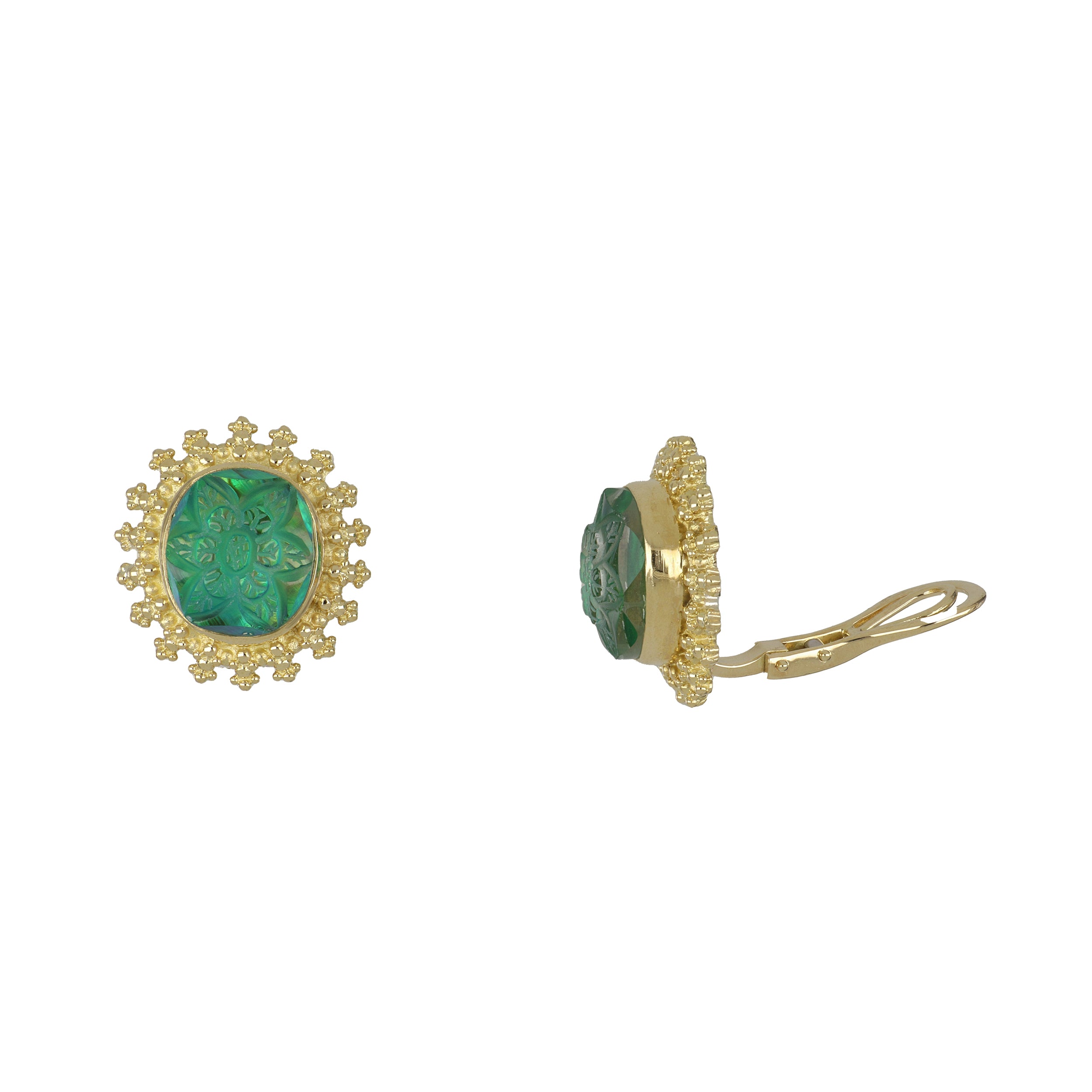 A pair of estate Stephen Dweck carved quartz doublet button earrings, set in 18k yellow gold frames.