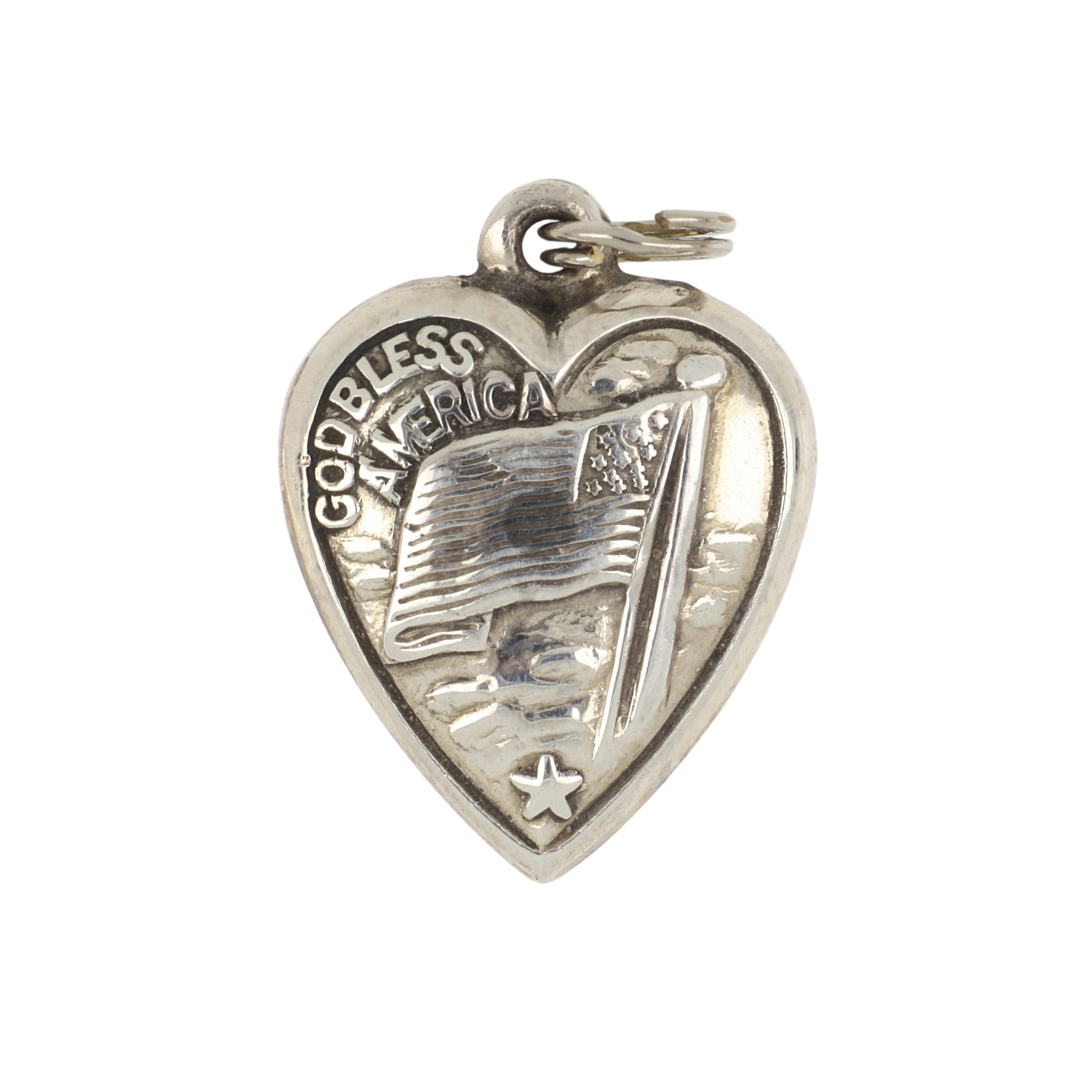 An estate sterling silver "God Bless America" heart charm with an American flag.
