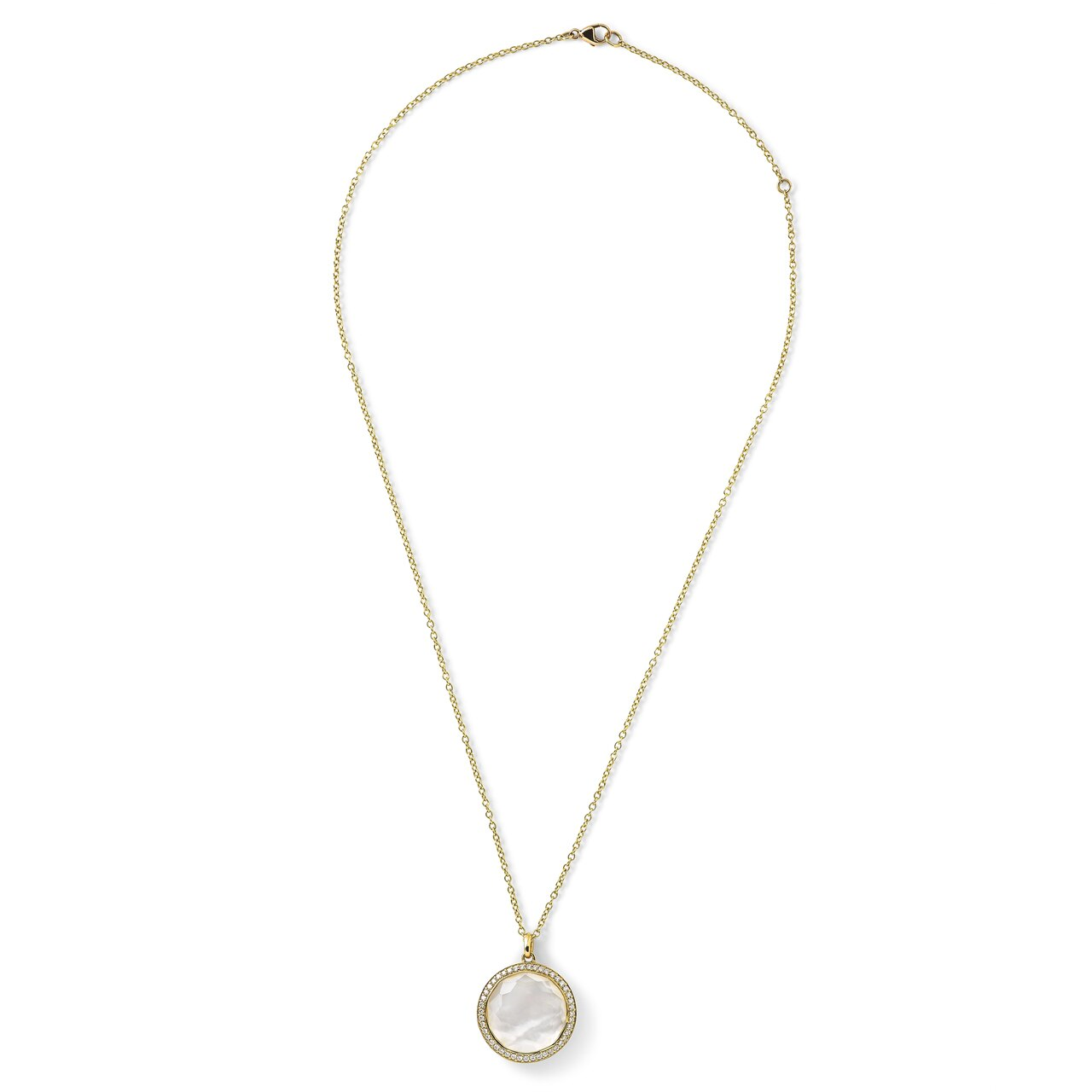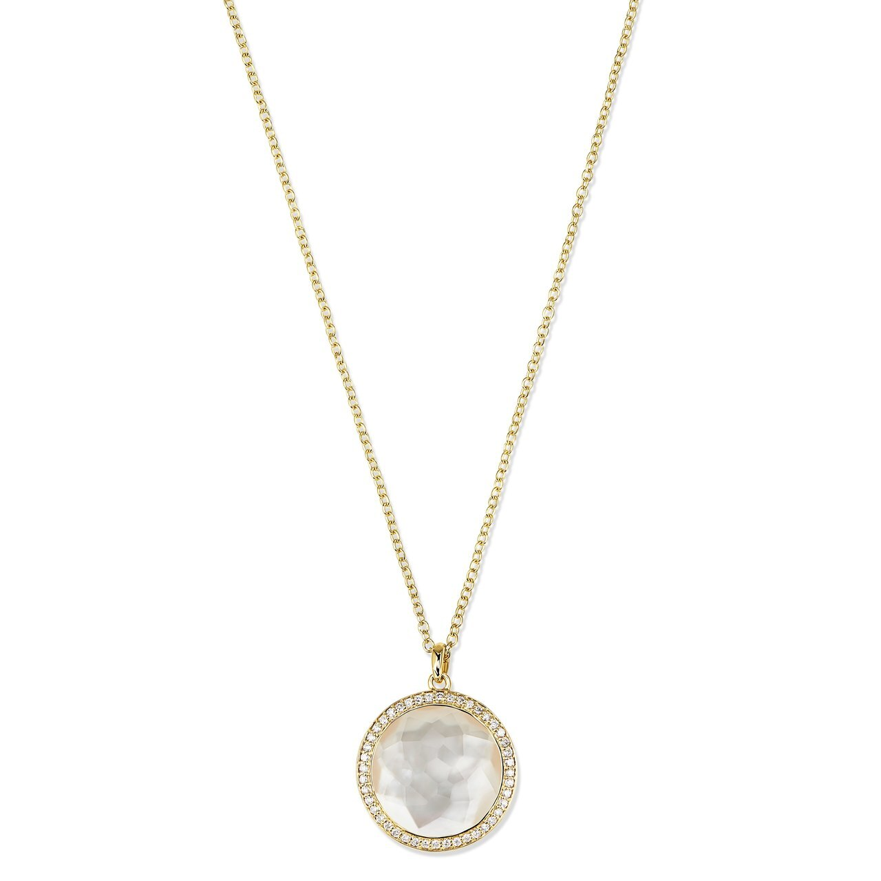 An Ippolita Lollipop medium pendant necklace with a mother of pearl doublet and a pave diamond border, set in 18K yellow gold.
