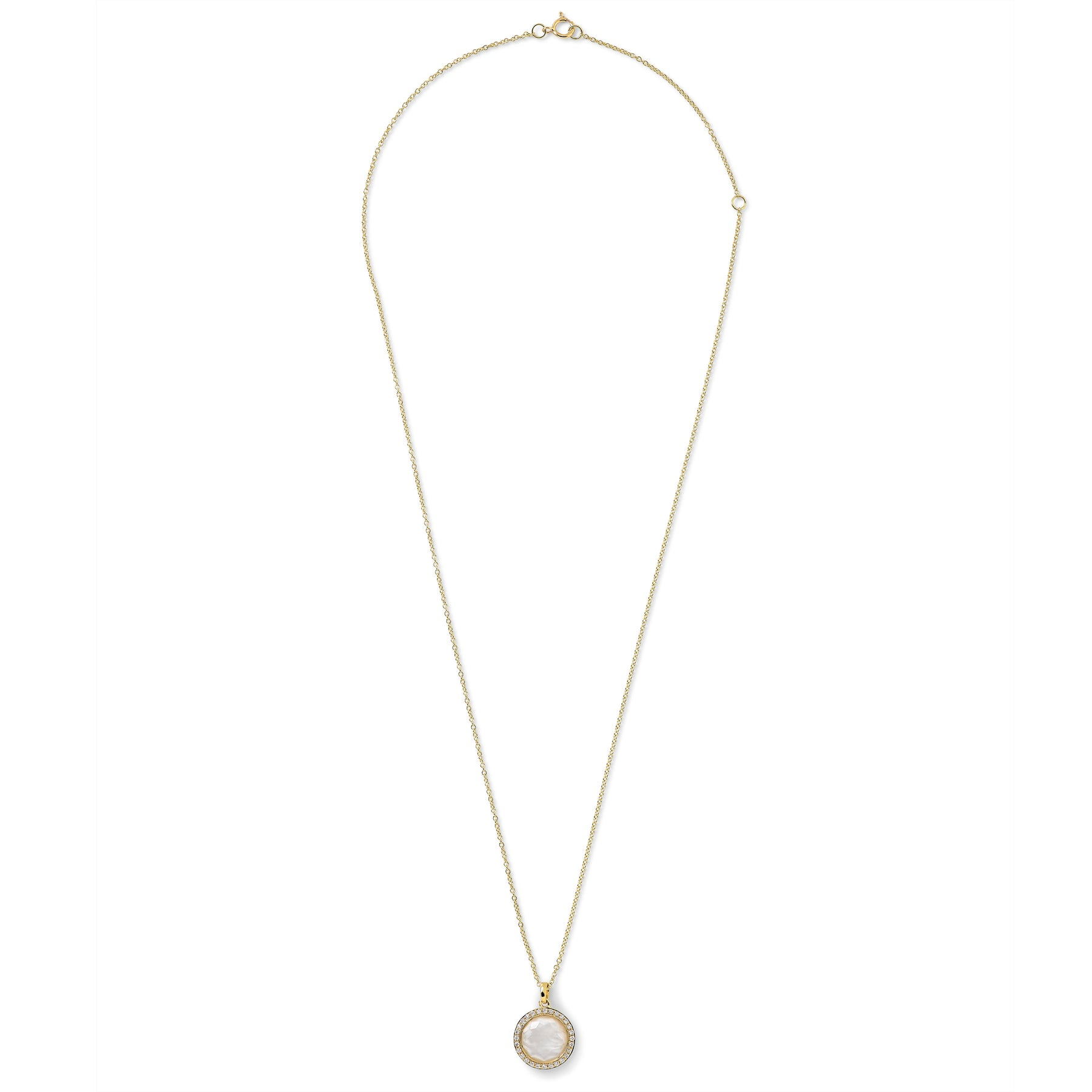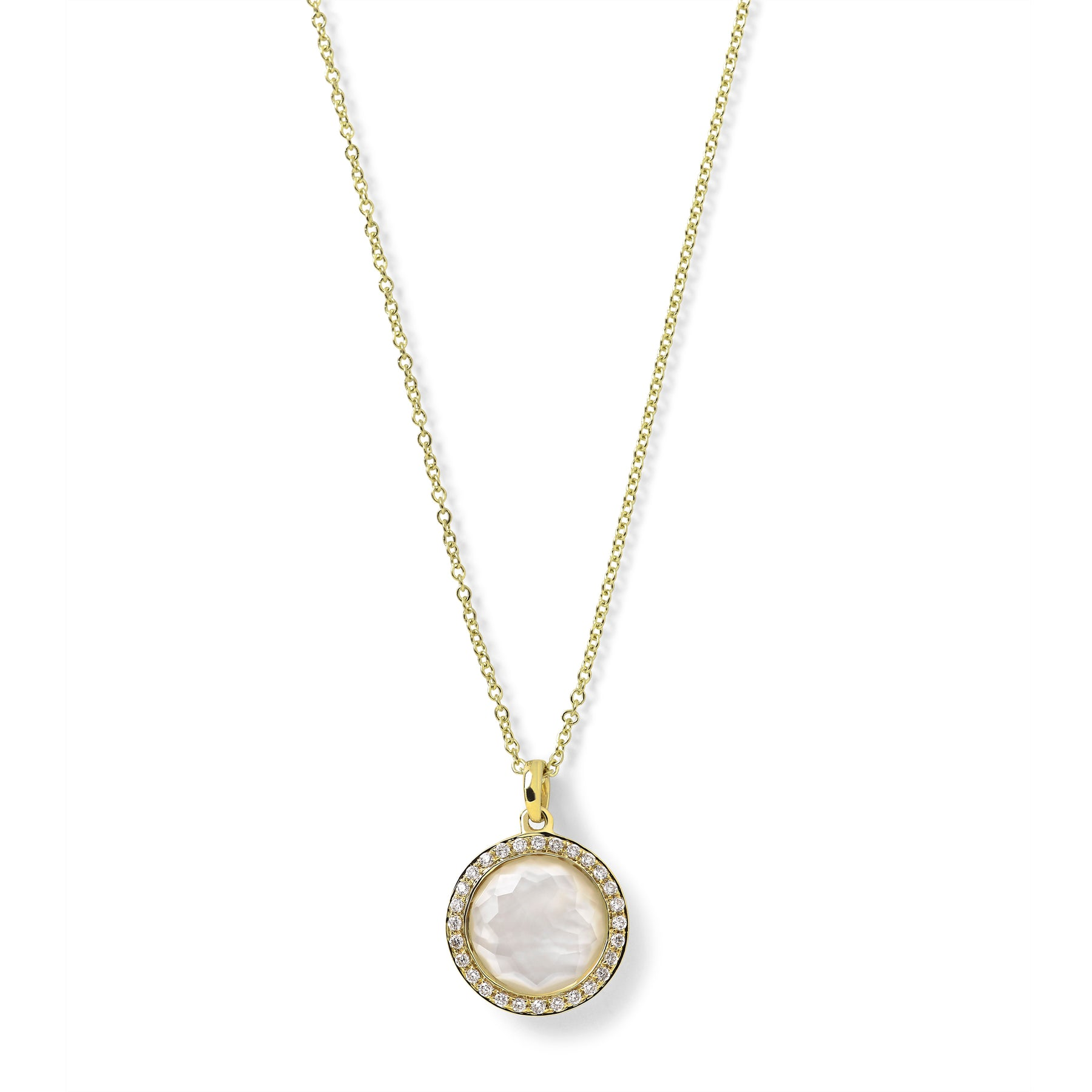 An Ippolita Lollipop small pendant necklace with a mother of pearl doublet and a diamond border, set in 18K yellow gold.