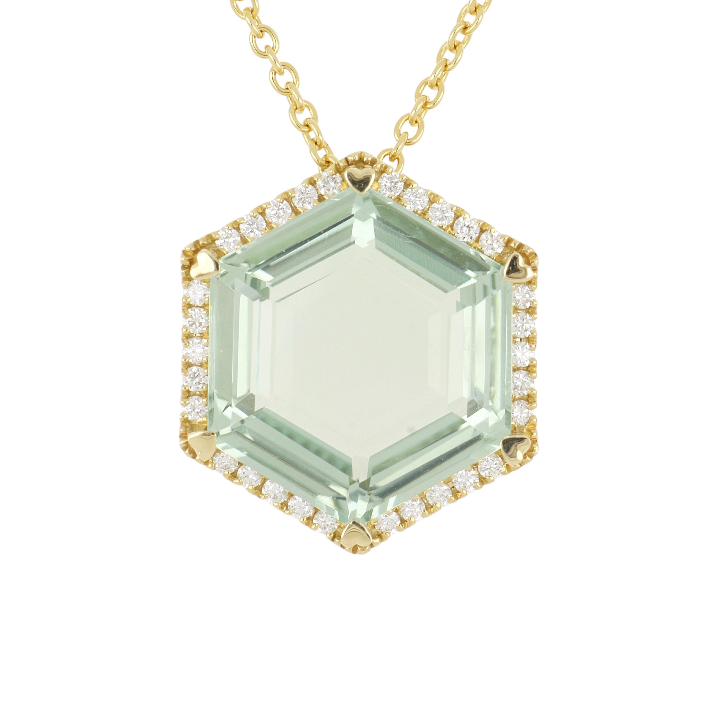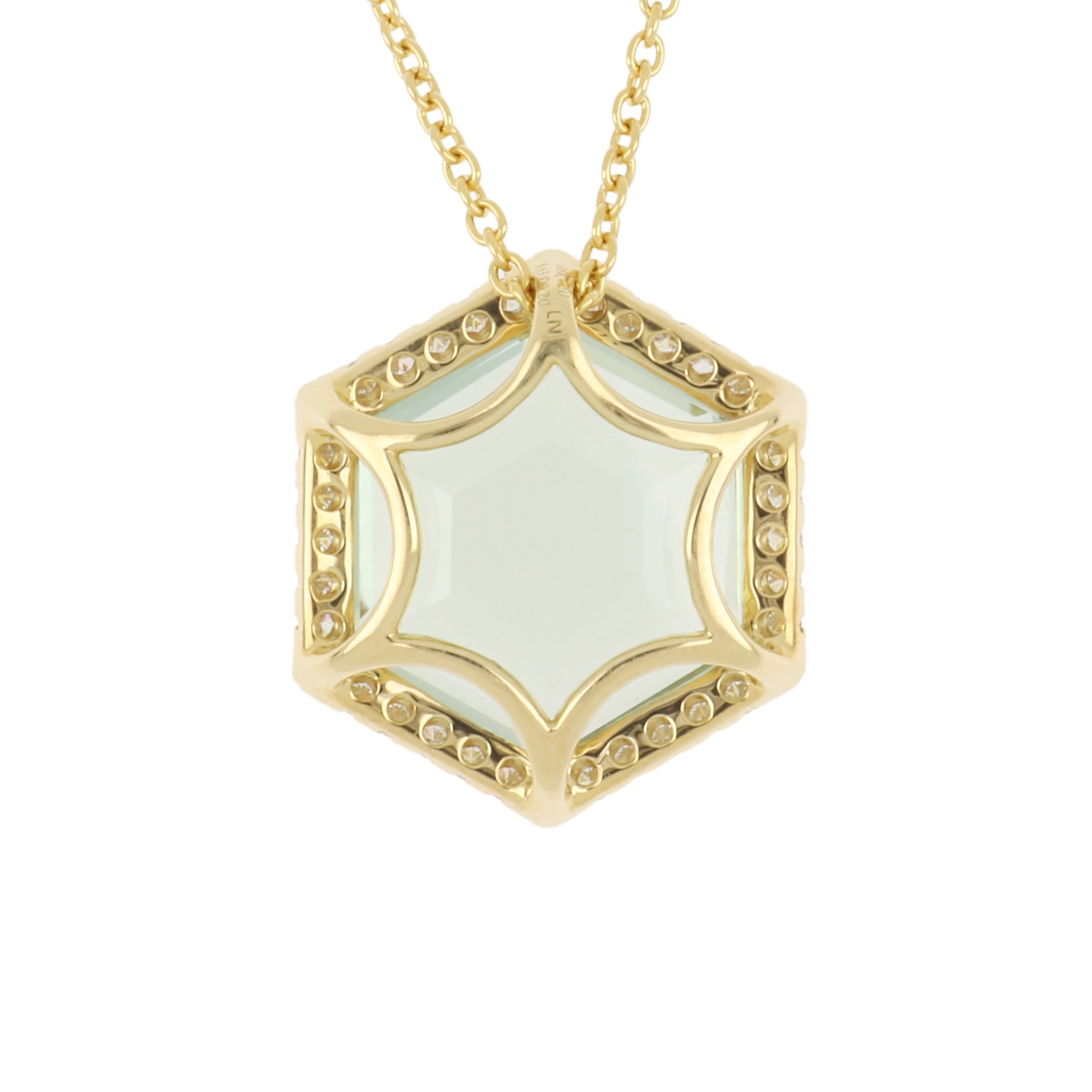 A Lisa Nik hexagon shaped green quartz necklace with diamonds, set in 18K yellow gold.