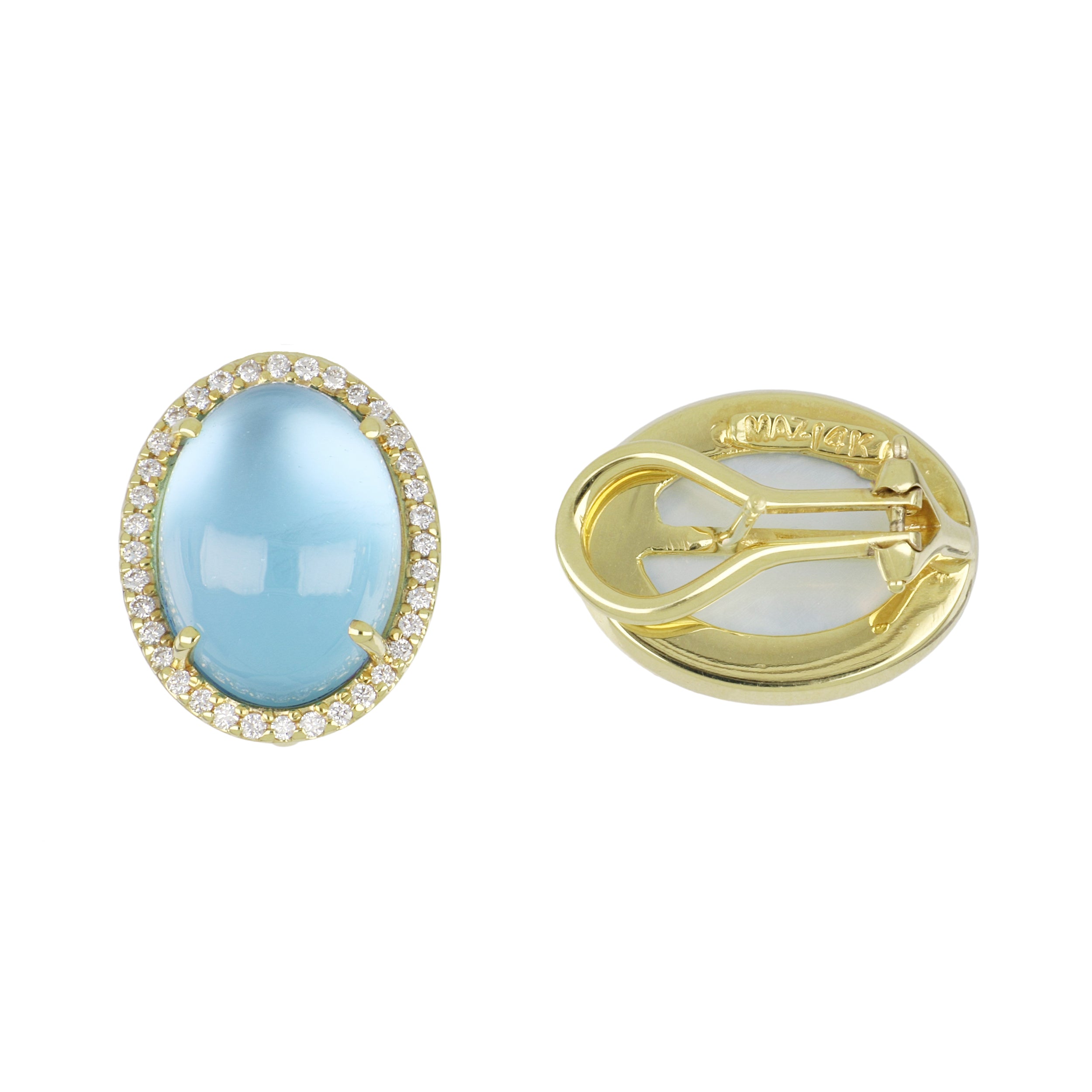 A pair of Mazza Mother-of-Pearl backed oval cabochon London blue topaz earrings with round brilliant-cut diamond borders, set in 14K yellow gold.