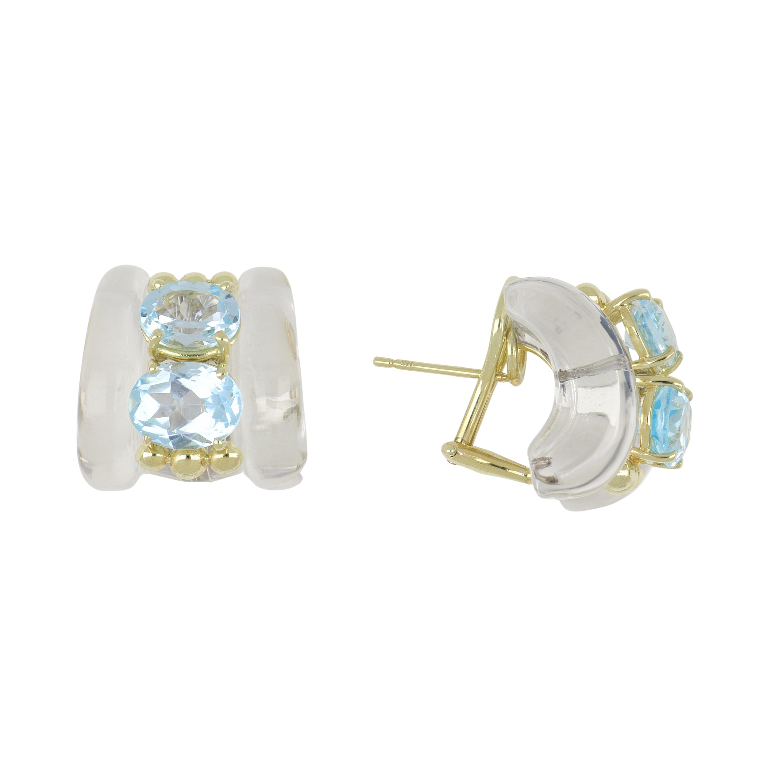 A pair of Mazza "Crystal Saddle" earrings featuring carved rock crystal frames with oval-cut blue topaz centers, set in 14K yellow gold.