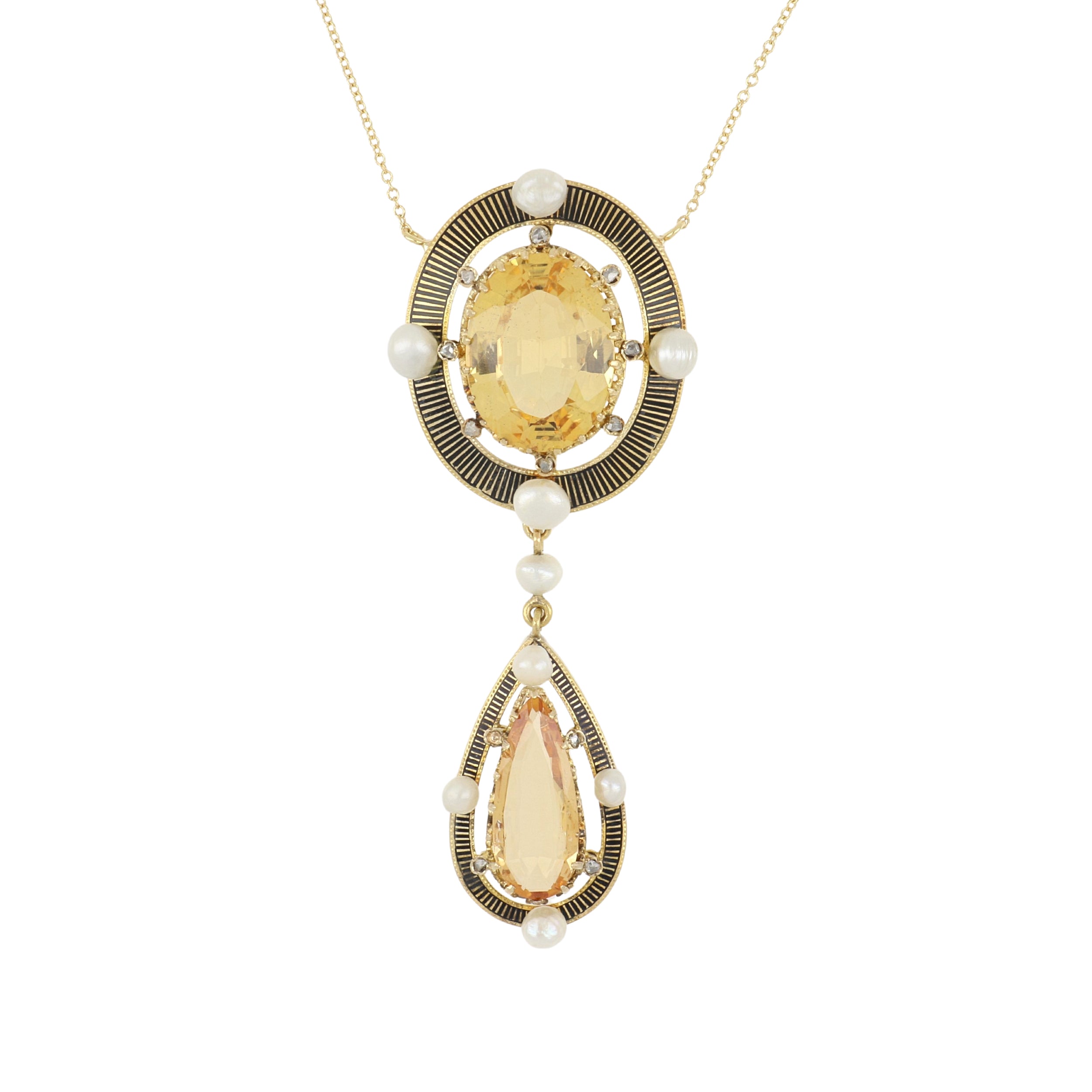 A Mid Victorian yellow topaz pendant necklace with pearls, black enamel tracery, and small rose-cut diamond accents, set in 18K yellow gold. Circa 1860. Note: Necklace was modified at a later date, and pendant may have been part of a larger piece.