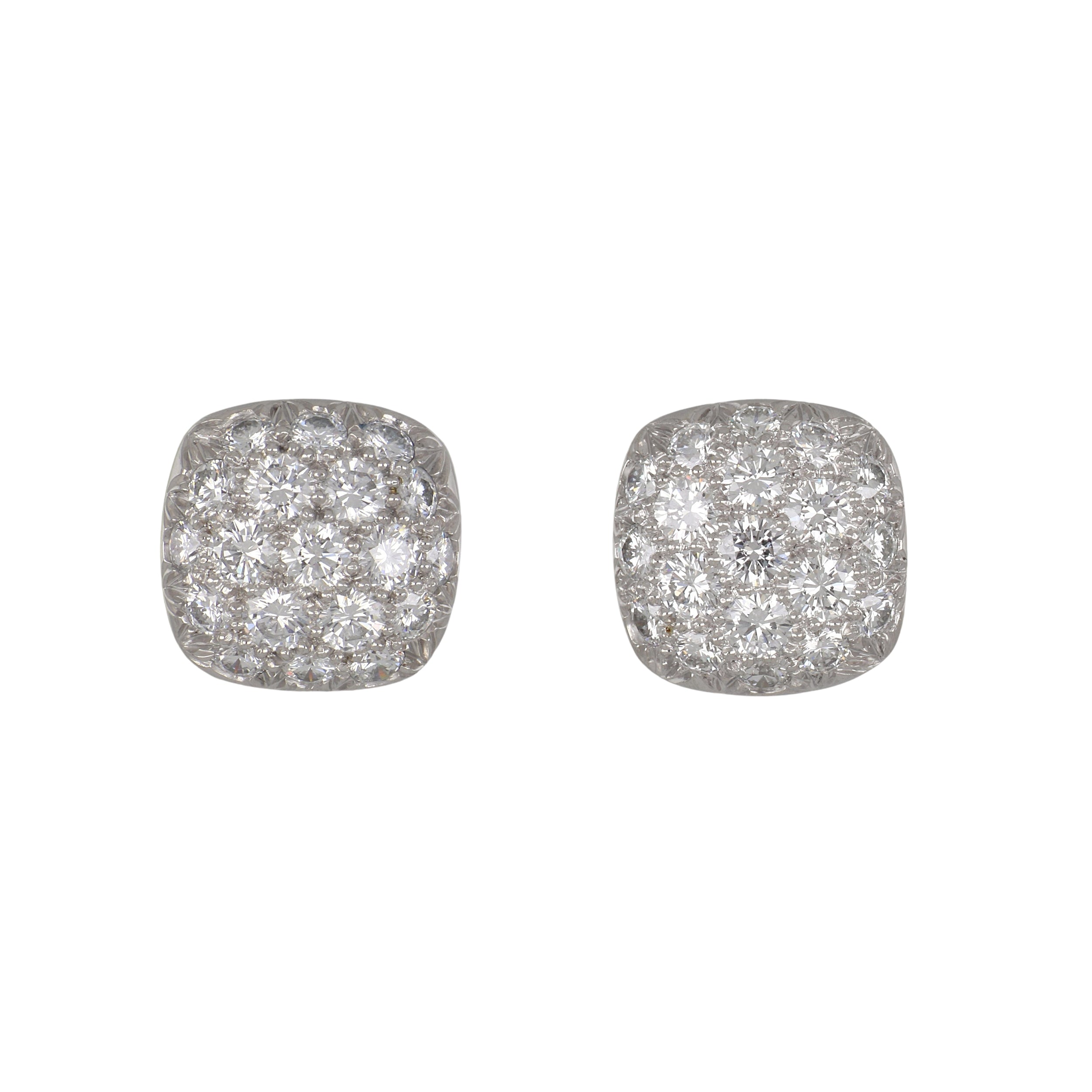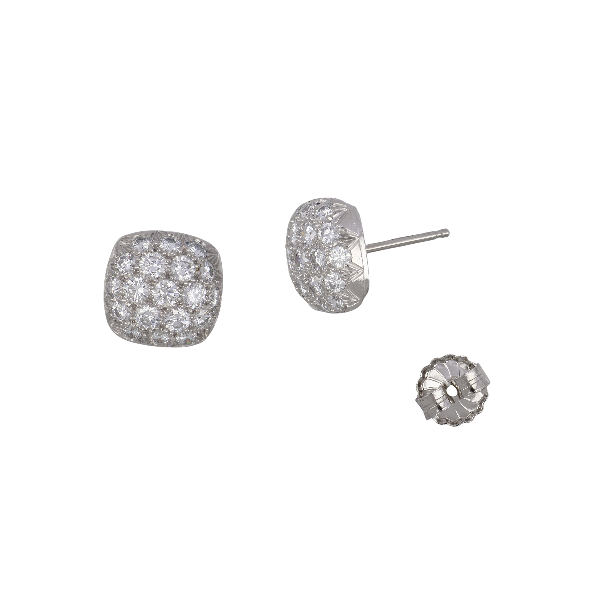 A pair of estate bespoke, cushion shape, pave-set round brilliant-cut diamond cluster earrings in platinum.