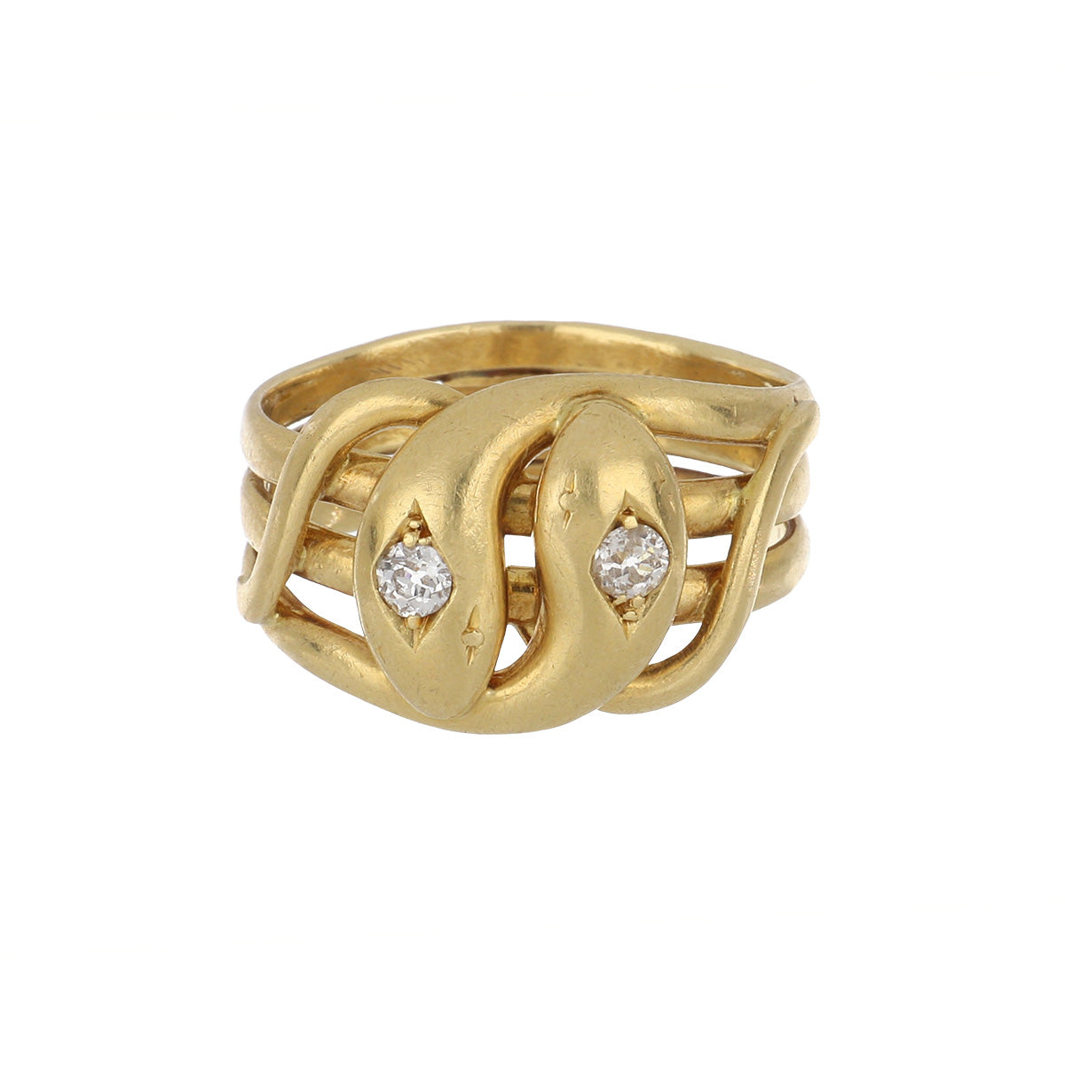 A Victorian 18k yellow gold twin serpent ring with old mine-cut diamonds. Circa 1860. A double snake ring with diamonds is a symbol of enduring, eternal love.