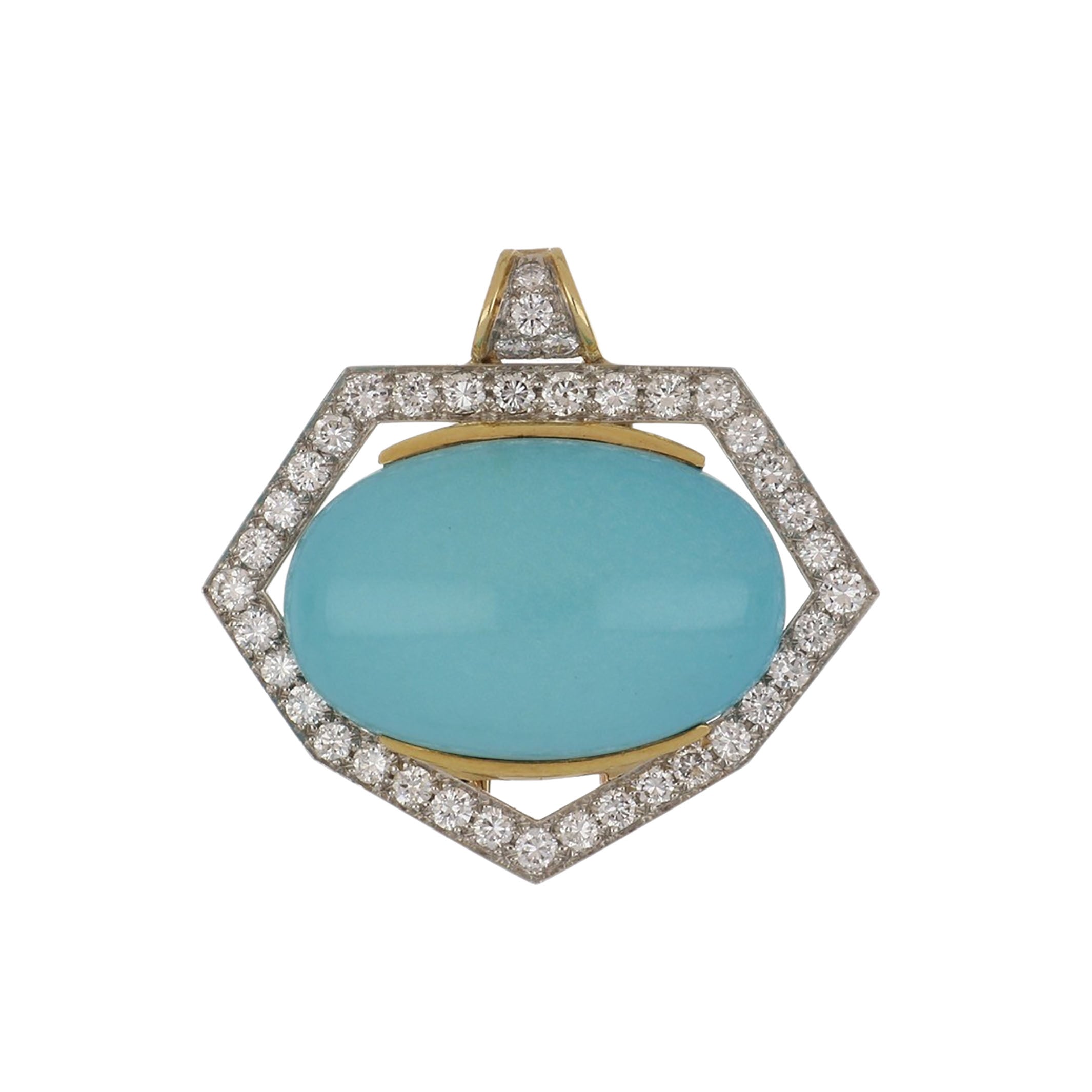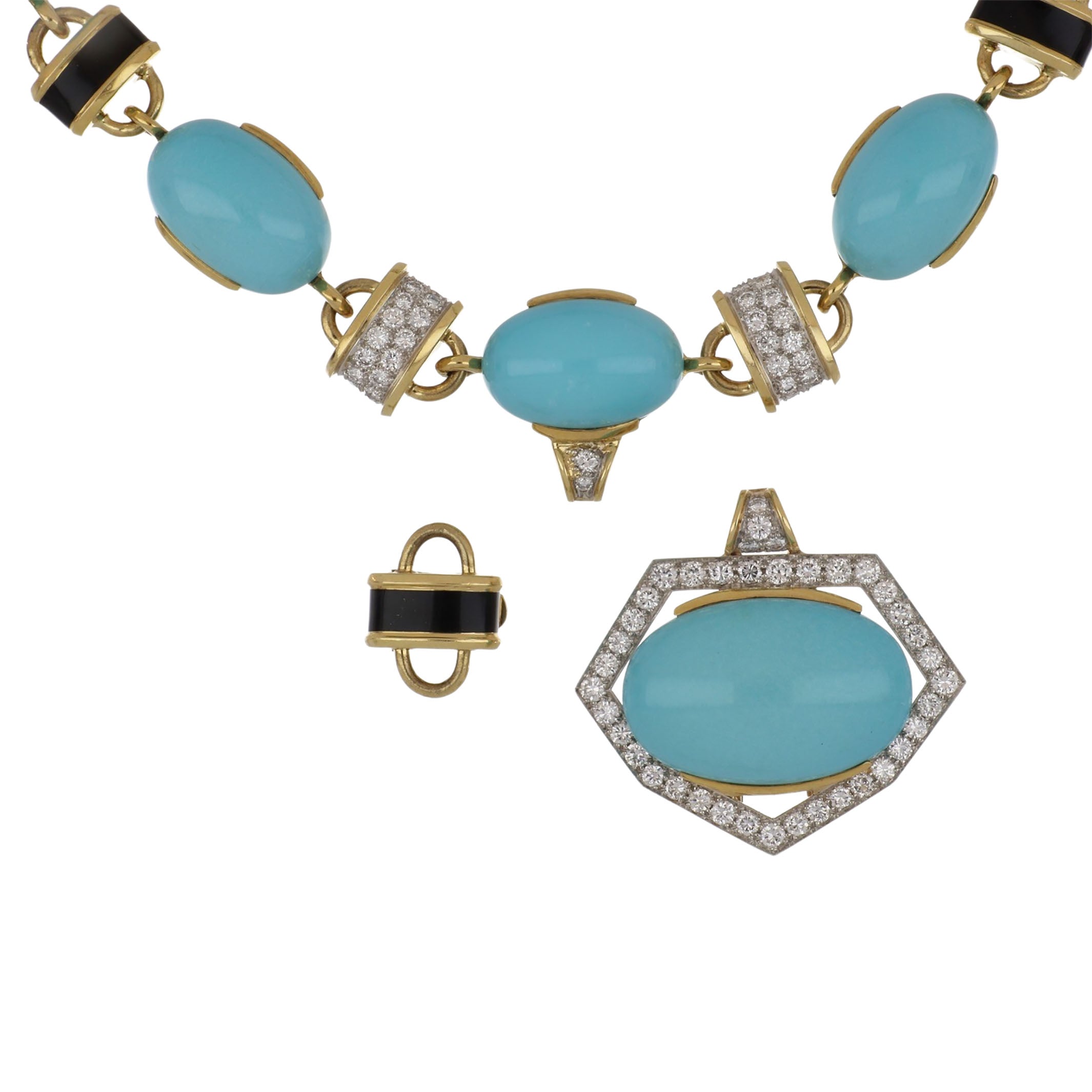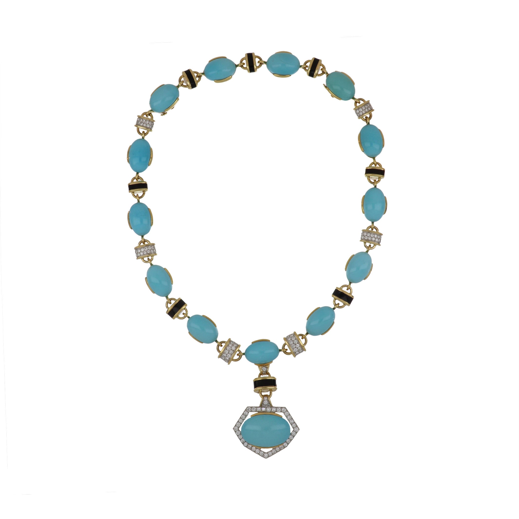 A vintage David Webb turquoise and diamond necklace with black enamel, set in 18K yellow gold and platinum, from the "Manhattan Minimalism" collection. The pendant can be removed and be worn as a pin. Circa 1980.