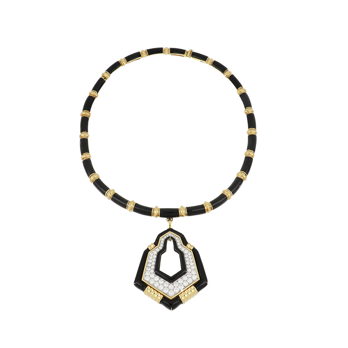 A vintage David Webb black enameled collar necklace, with detachable pendant featuring round brilliant-cut diamonds, set in 18K yellow gold and platinum. From the Manhattan Minimalism Collection. Circa 1990.
