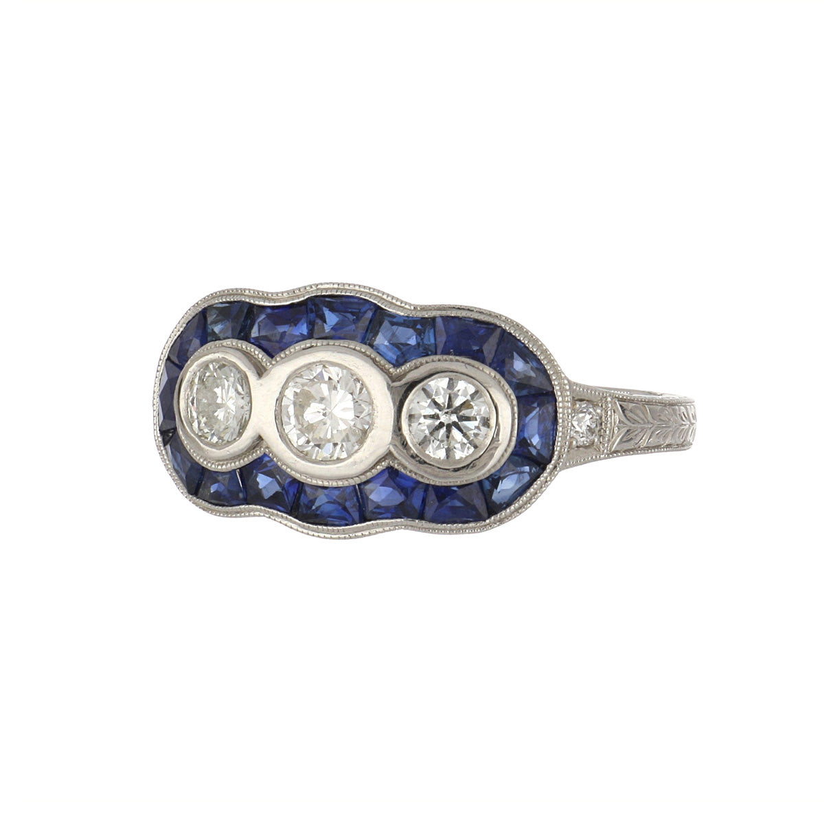 An Art Deco style round brilliant-cut diamond three-stone ring with a sapphire frame and diamond sides, set in platinum.