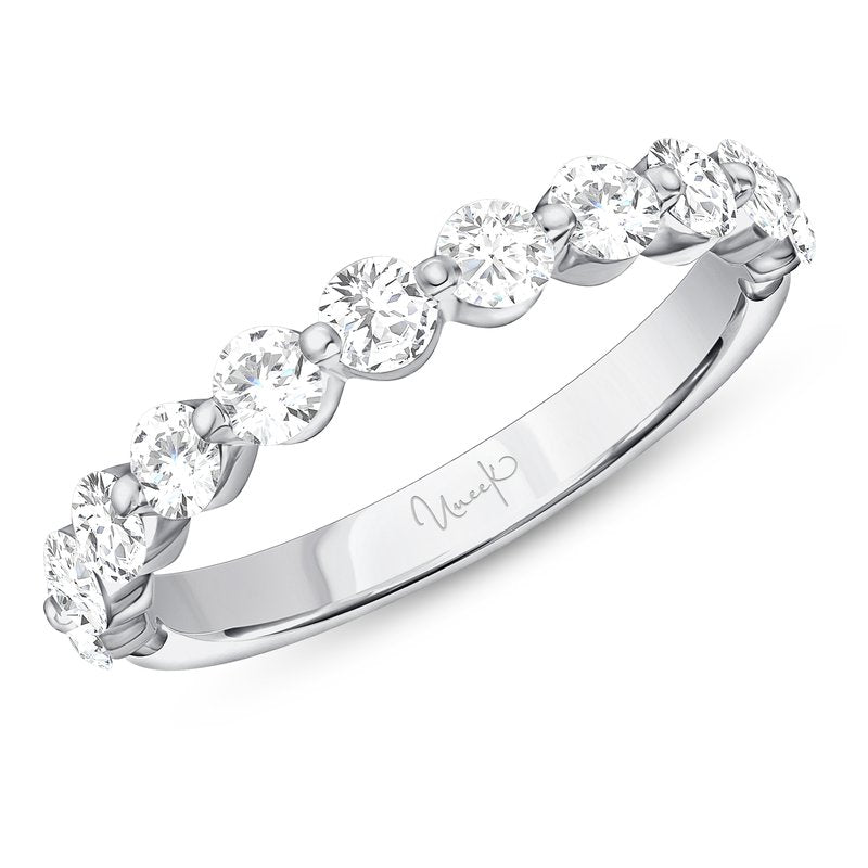 A 14K white gold round brilliant-cut diamond half band.