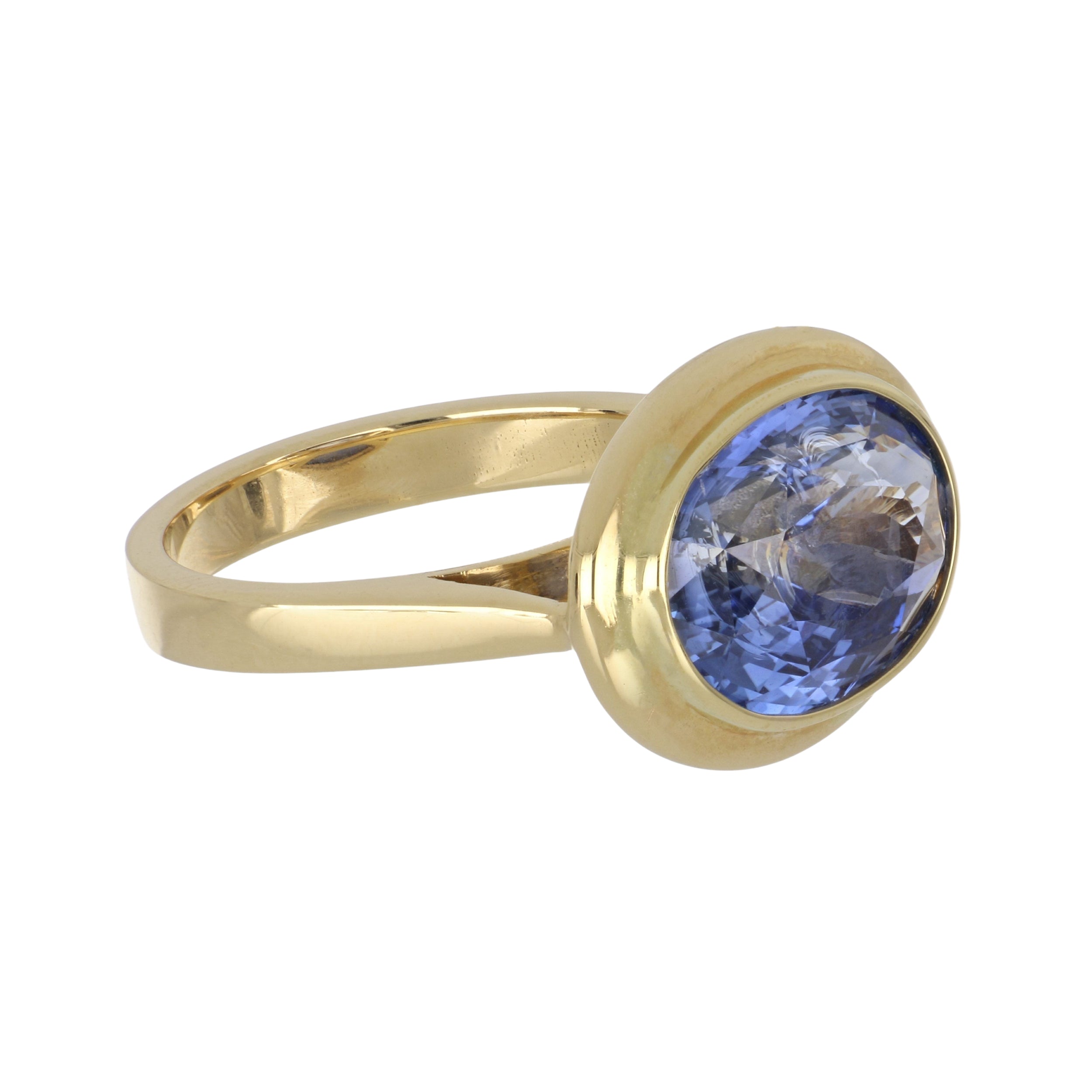 A solitaire ring featuring an east-west oval-cut sapphire in 18 karat yellow gold.