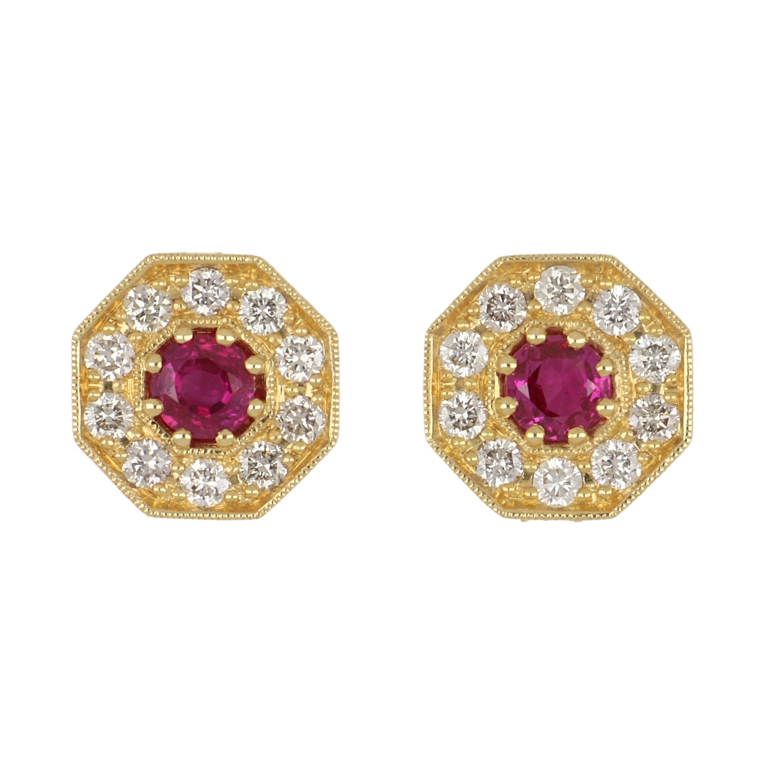 A pair of round-cut ruby and single-cut diamond halo octagon stud earrings, set in 18K yellow gold.