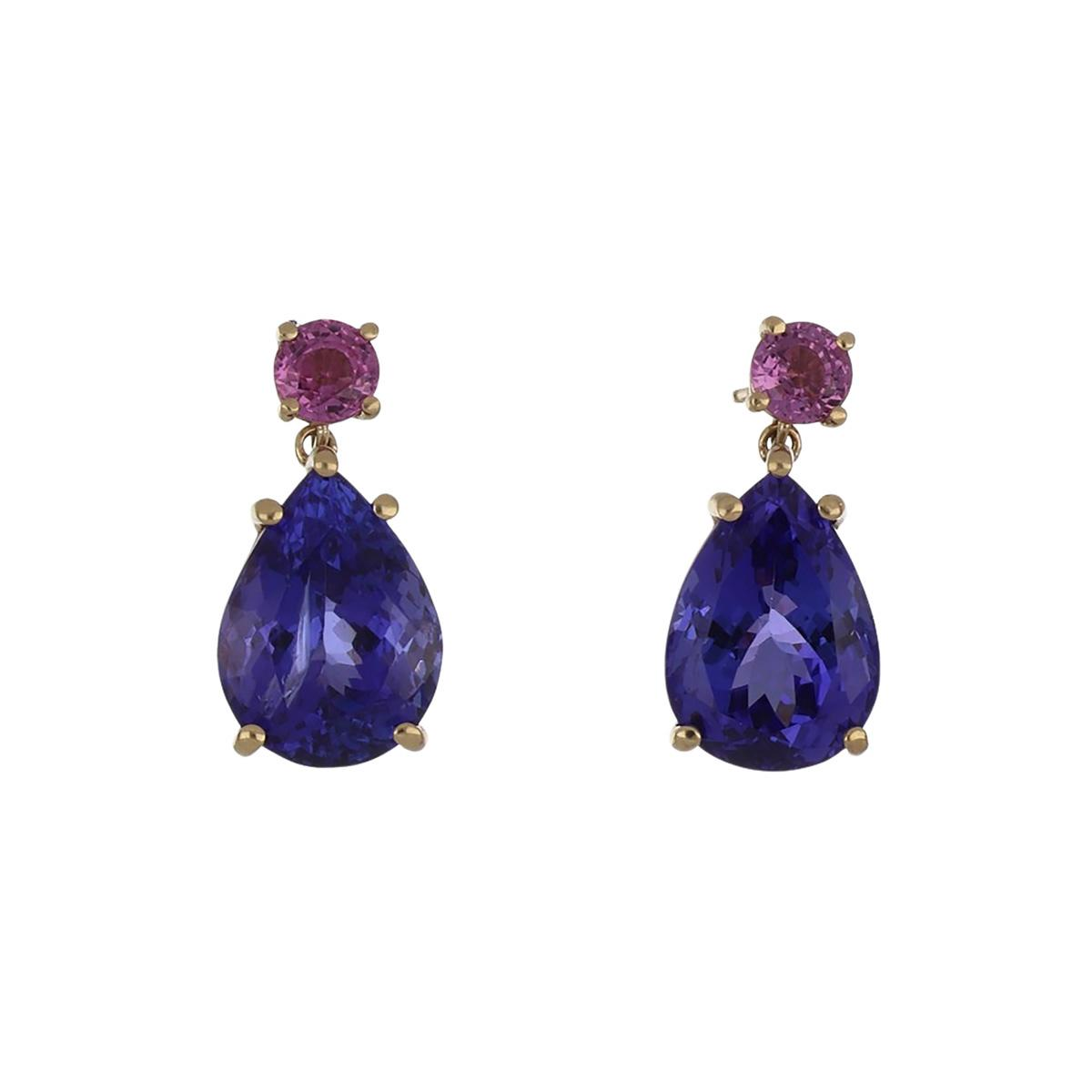A pair of pear-shape tanzanite and round pink sapphire drop earrings, in 18K yellow gold.