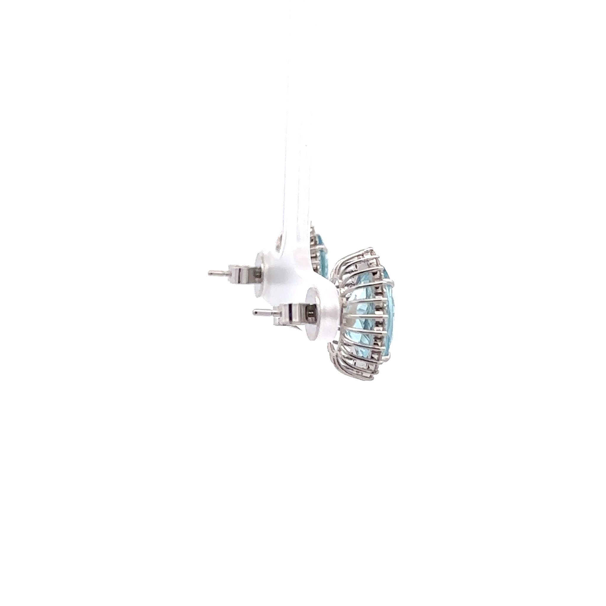 A pair of oval-cut aquamarine studs with round diamond halos, set in 18K white gold.