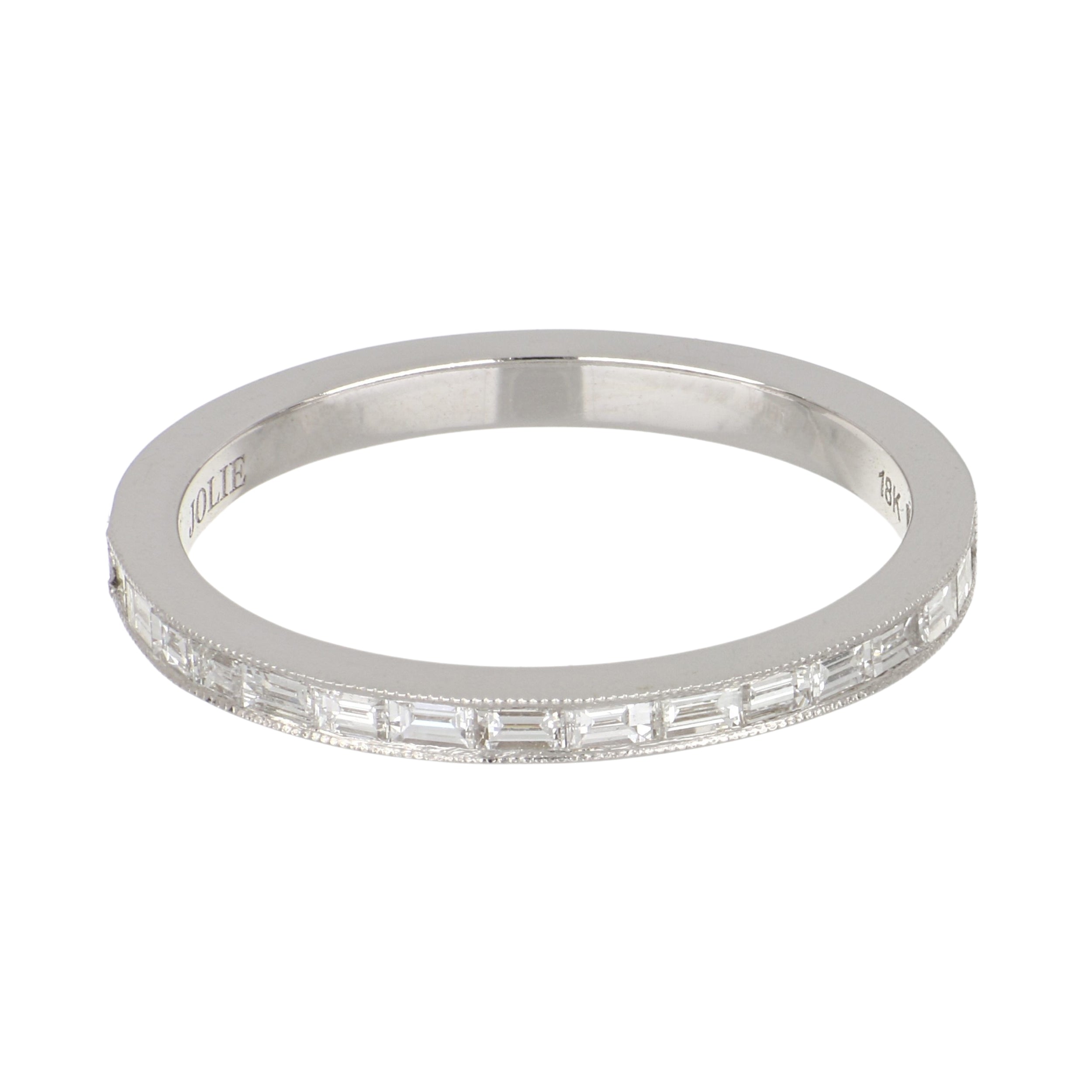A channel set baguette cut diamond half band, set in 18K white gold.
