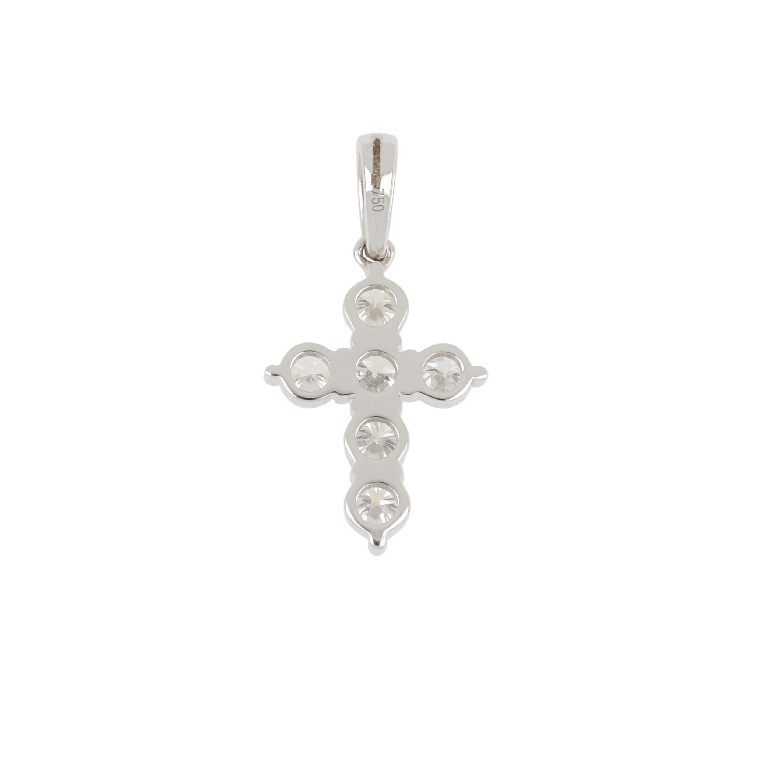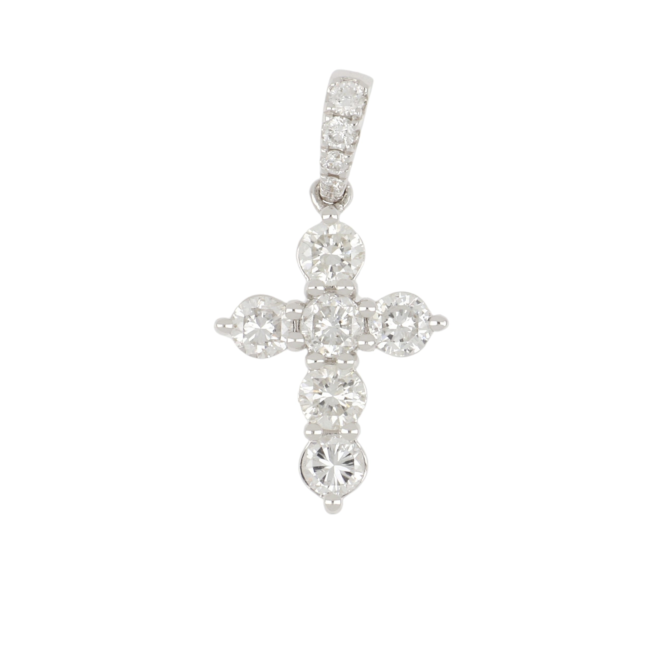 A round diamond cross with a diamond bail, set in 18K white gold.