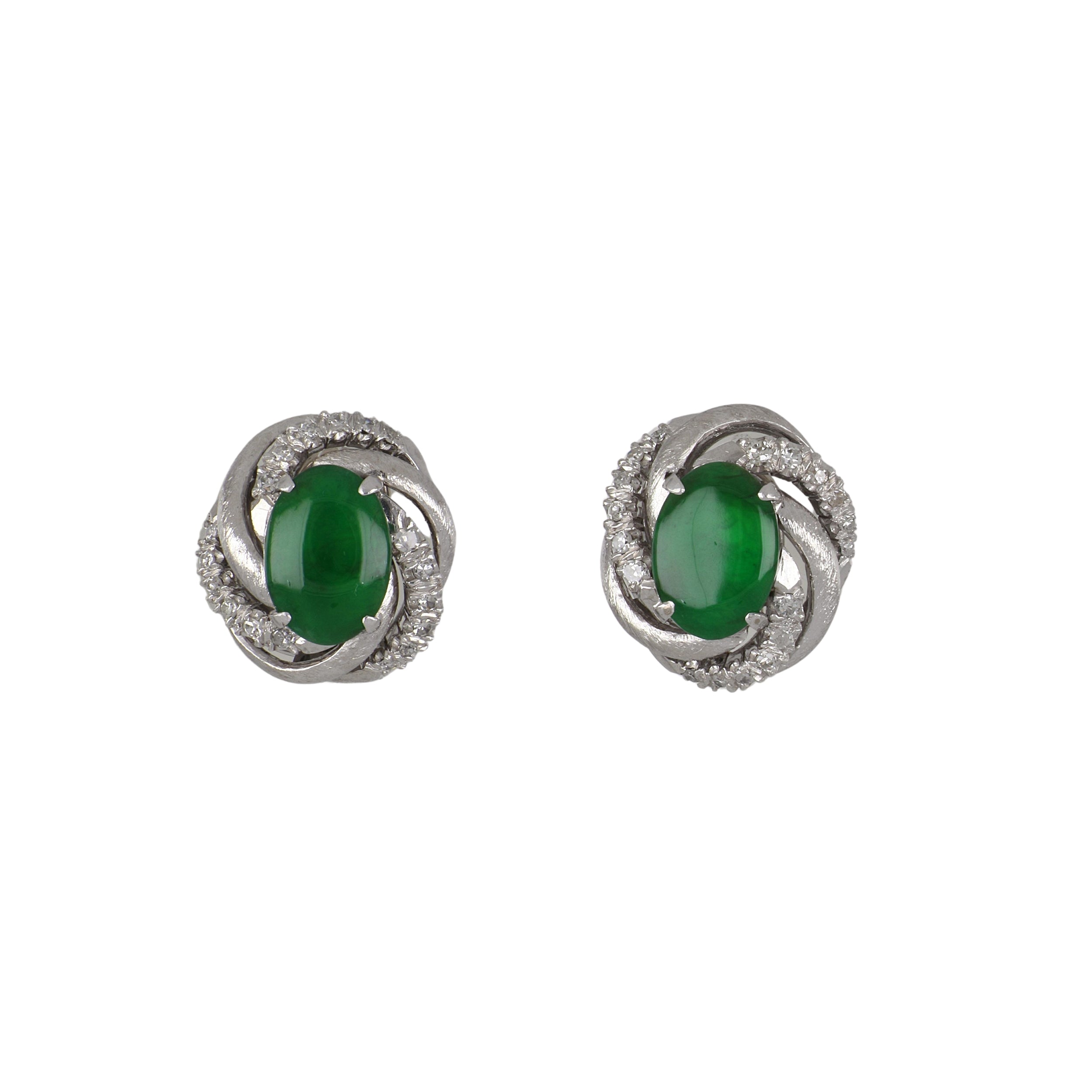 A pair of estate cabochon jadeite and single cut diamond ribbon earrings set in 18K white gold.
