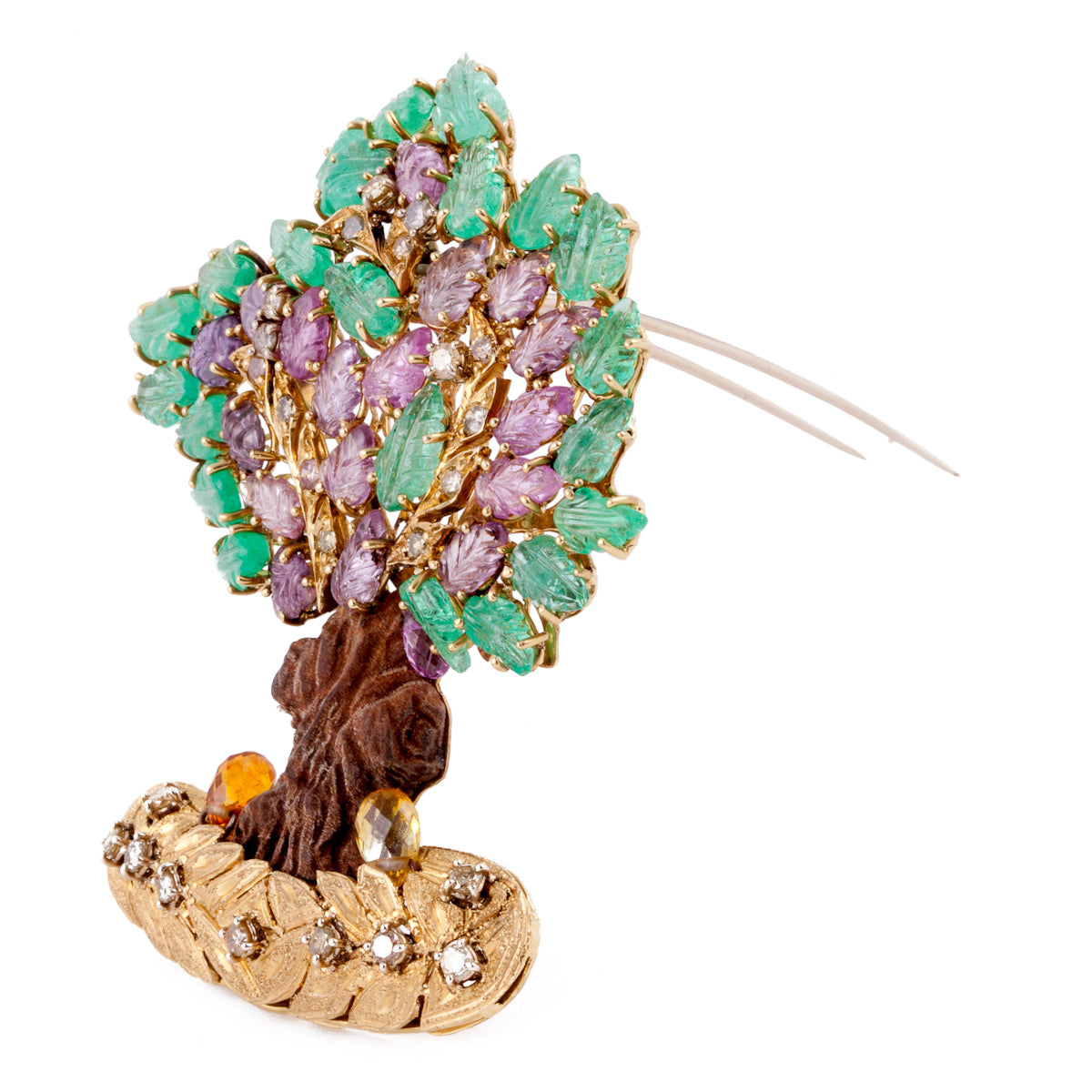 A vintage Nardi tree brooch featuring carved emeralds, rubies, citrines, wood and round brilliant-cut diamonds, set in 18K yellow gold. Circa 1970.