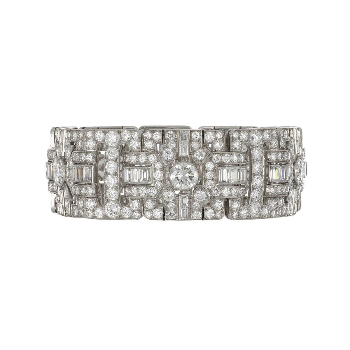 An estate antique masterpiece, Art-Deco Cartier platinum old european-cut round diamond and baguette-cut diamond plaque bracelet. This piece is signed on the reverse of catch, with serial number along edge of plaque. Circa 1930.