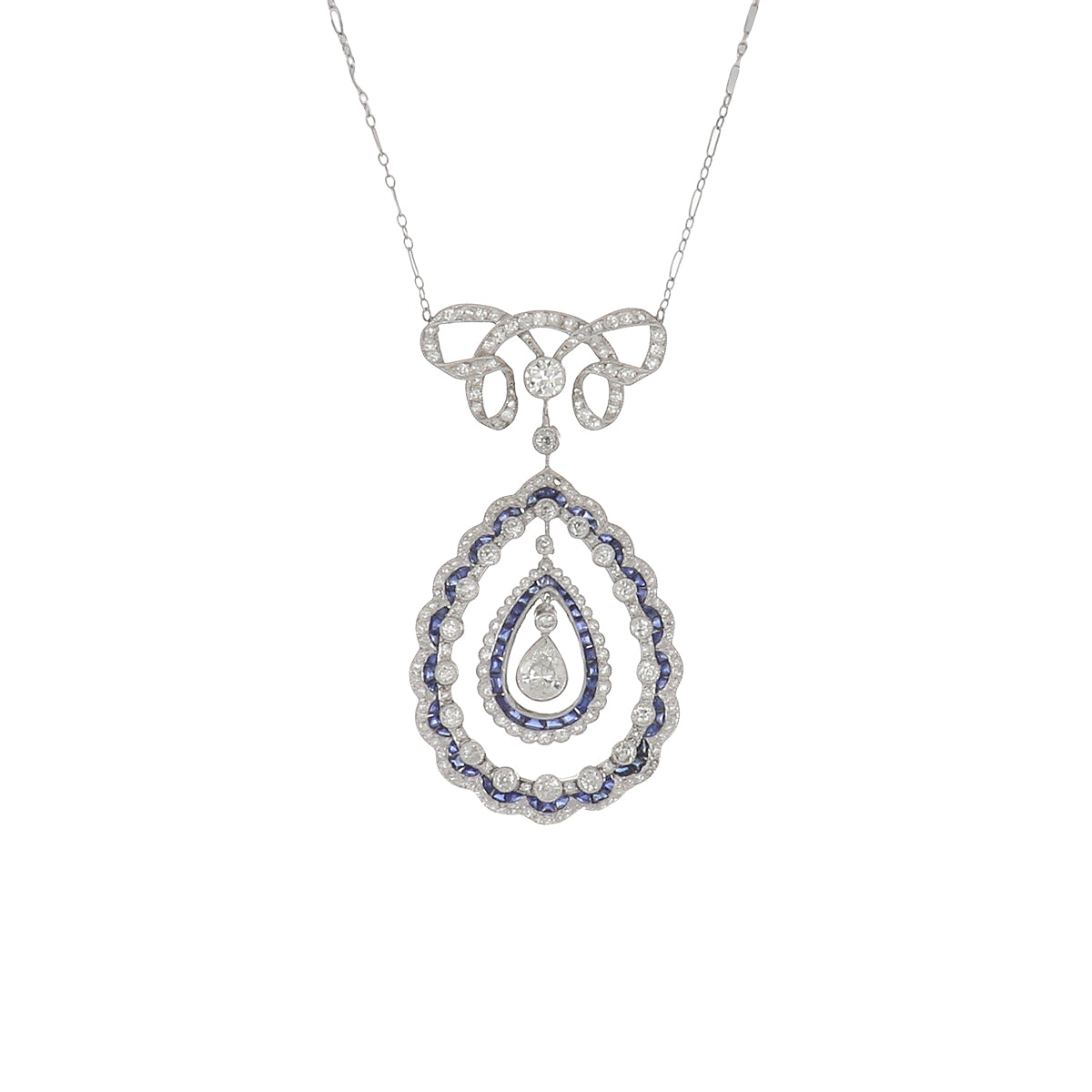 An estate contemporary, Edwardian style round brilliant-cut diamond and calibre-cut sapphire pendant necklace featuring a drop pear brilliant-cut diamond on a fancy link chain, set in 18K white gold.