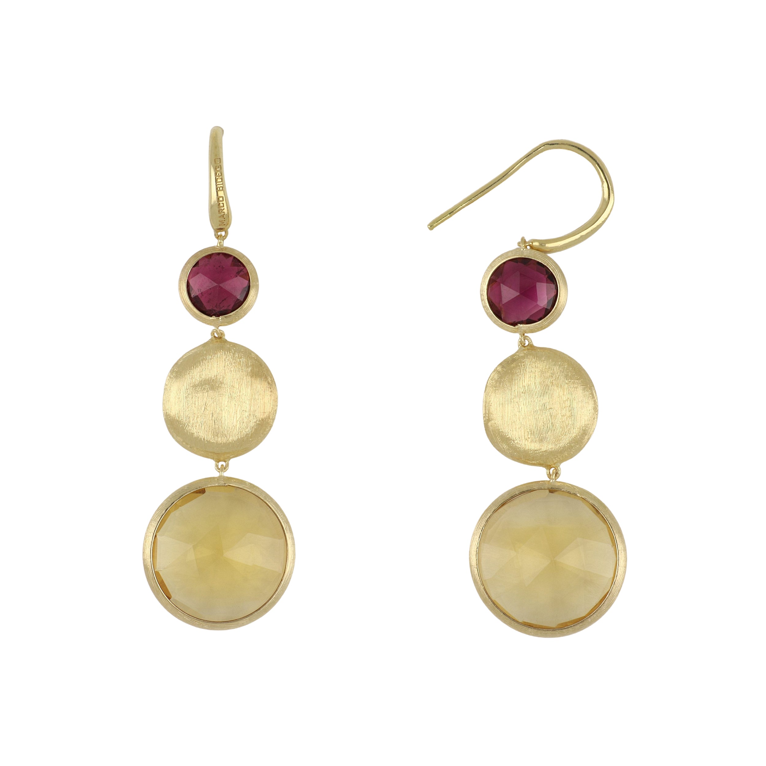 A pair of estate Marco Bicego checkerboard-cut garnet and citrine drop earrings, set in 18K yellow gold. Circa 2020.